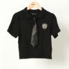 タイ付き&ショート丈のトレンドトップス。程良いストレッチと柔らかい素材のリブトップスは、着心地抜群◎身頃はワッペン付きのスキッパータイプだから、タイ無しで着てもgood☆ミニボトムを合わせれば一気に韓国コーデに♪