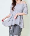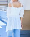 細かいプリーツが生み出す立体感と、ふんわり広がるシルエットが印象的。オフショルダーで肩まわりをすっきり見せつつ、シャーリング仕様で着心地も◎袖には程よいボリュームがあり、フェミニンなムードを演出します。