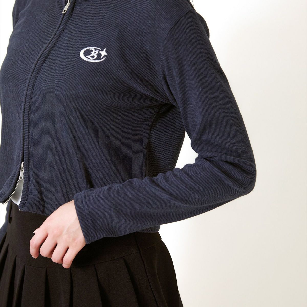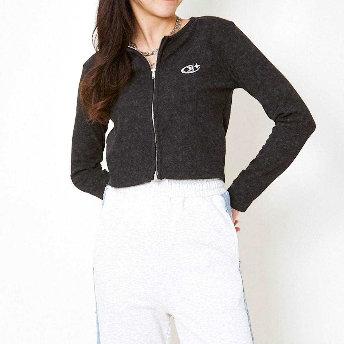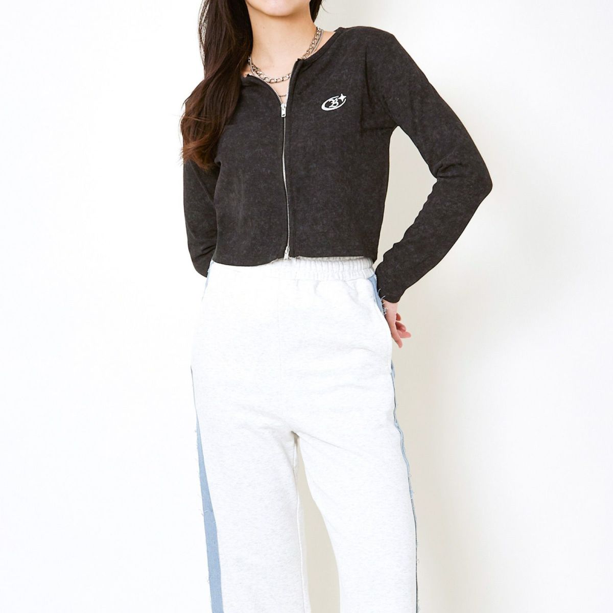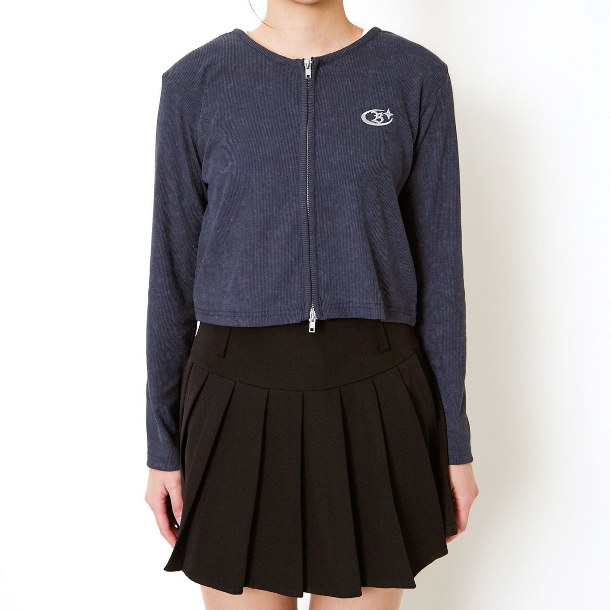 《ダブルジップ×ロゴ刺繍》ストリートニットトップ/WZIPカーデ