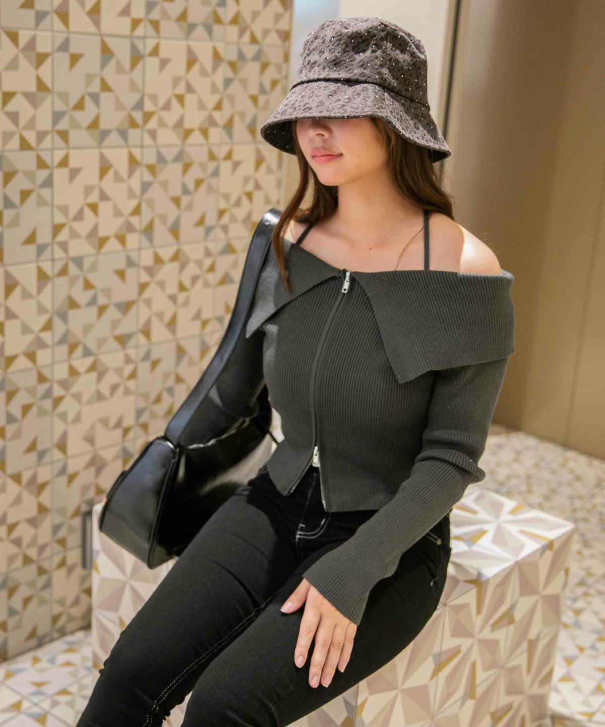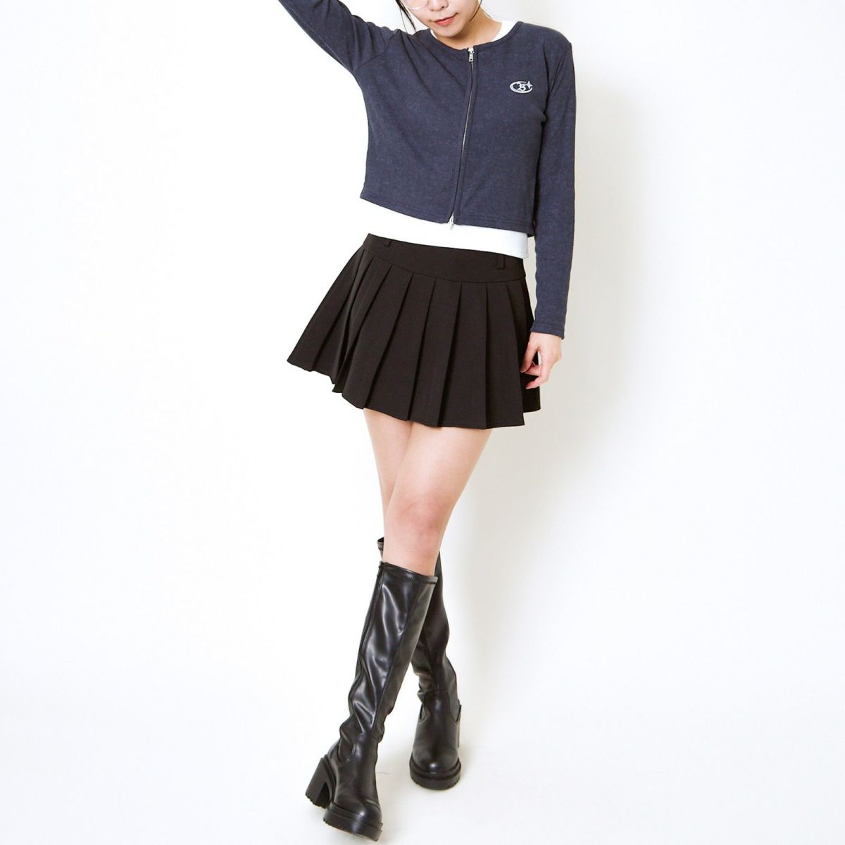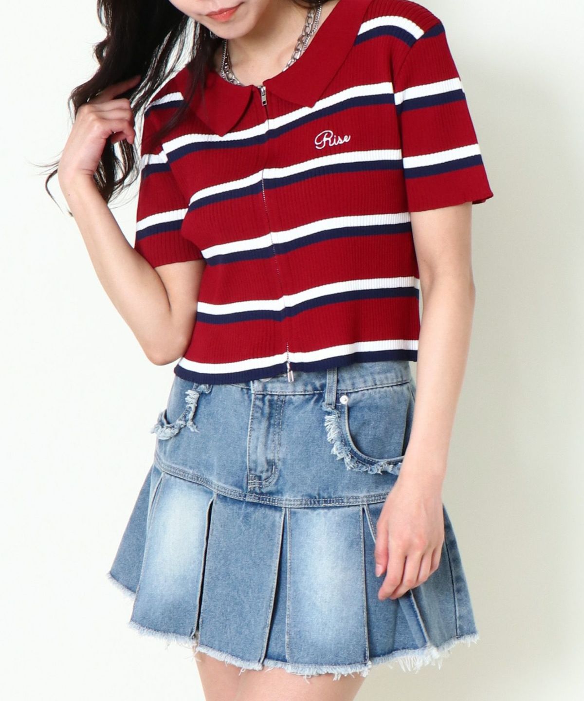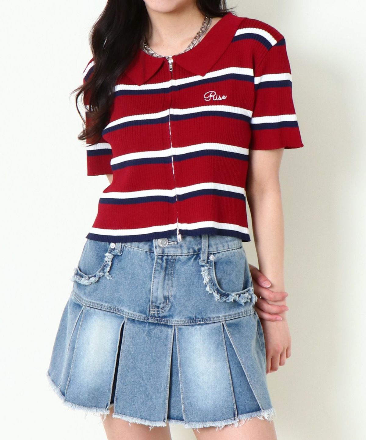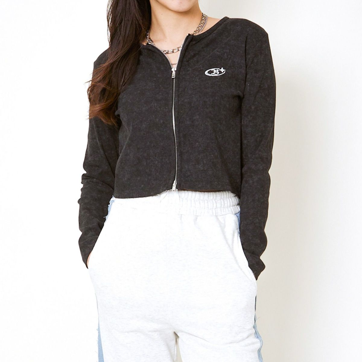 《ダブルジップ×ロゴ刺繍》ストリートニットトップ/WZIPカーデ