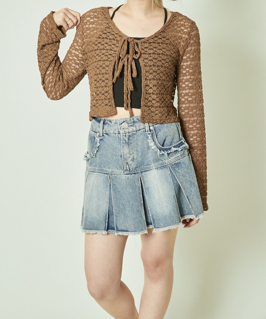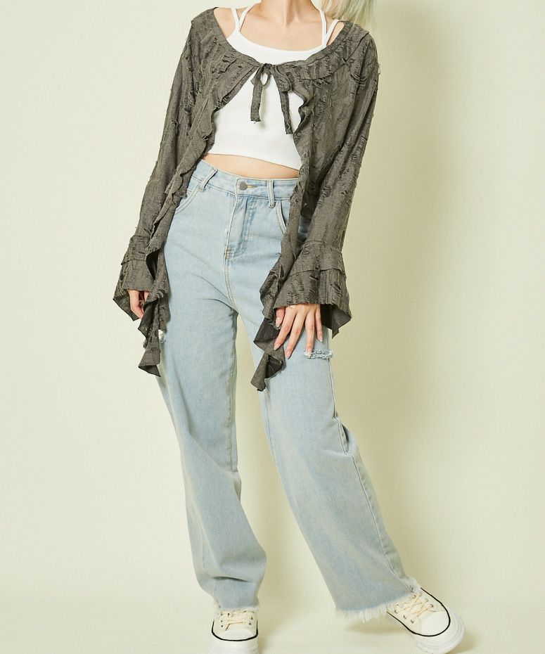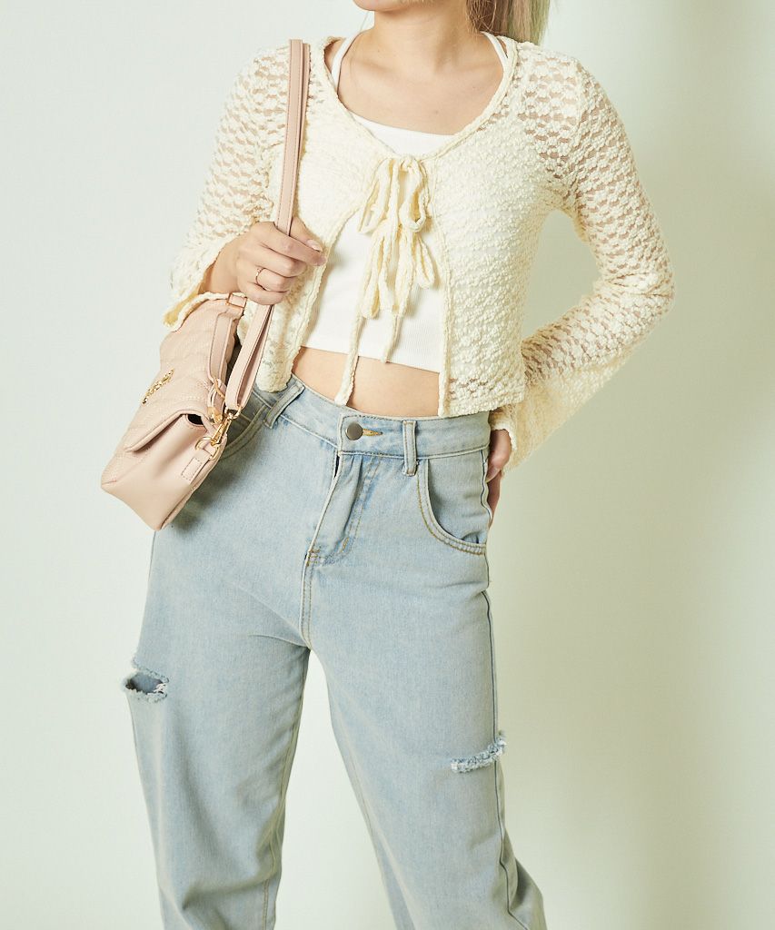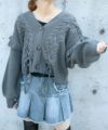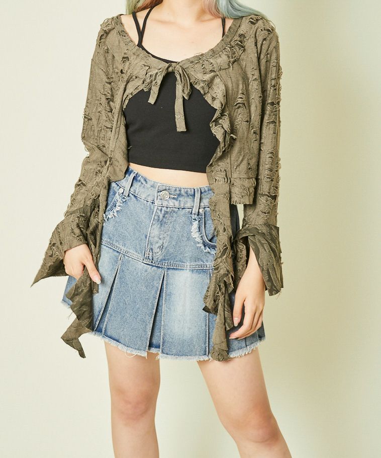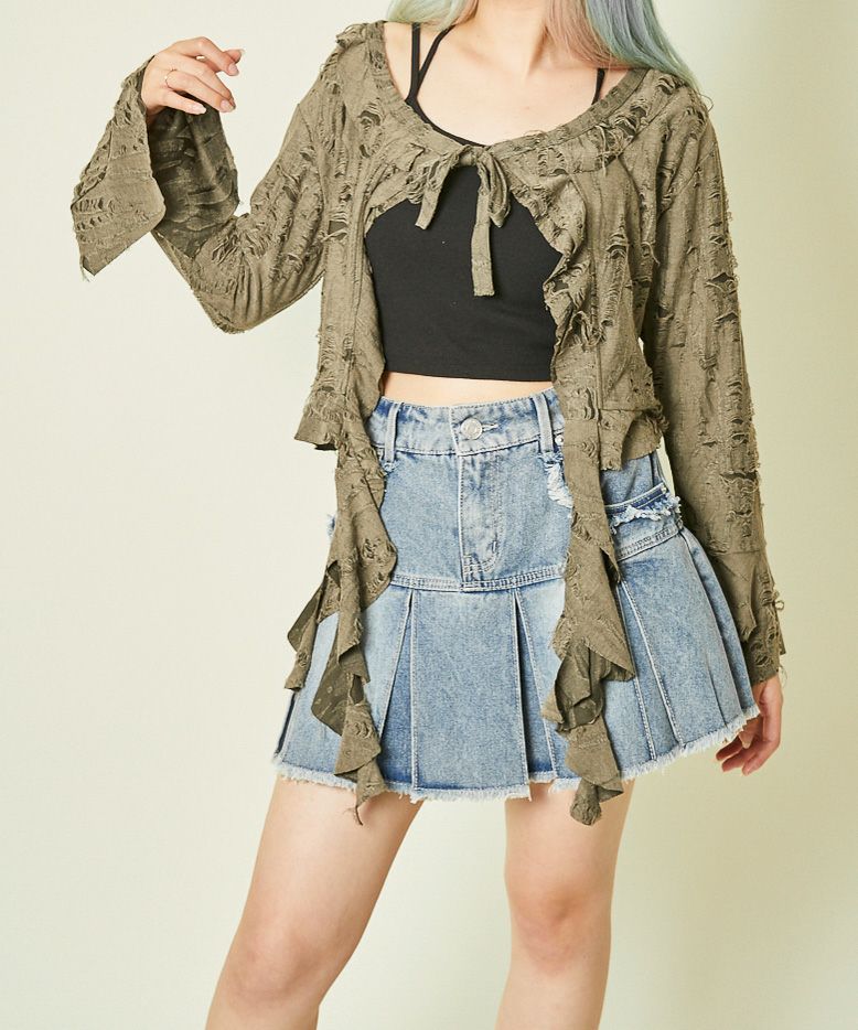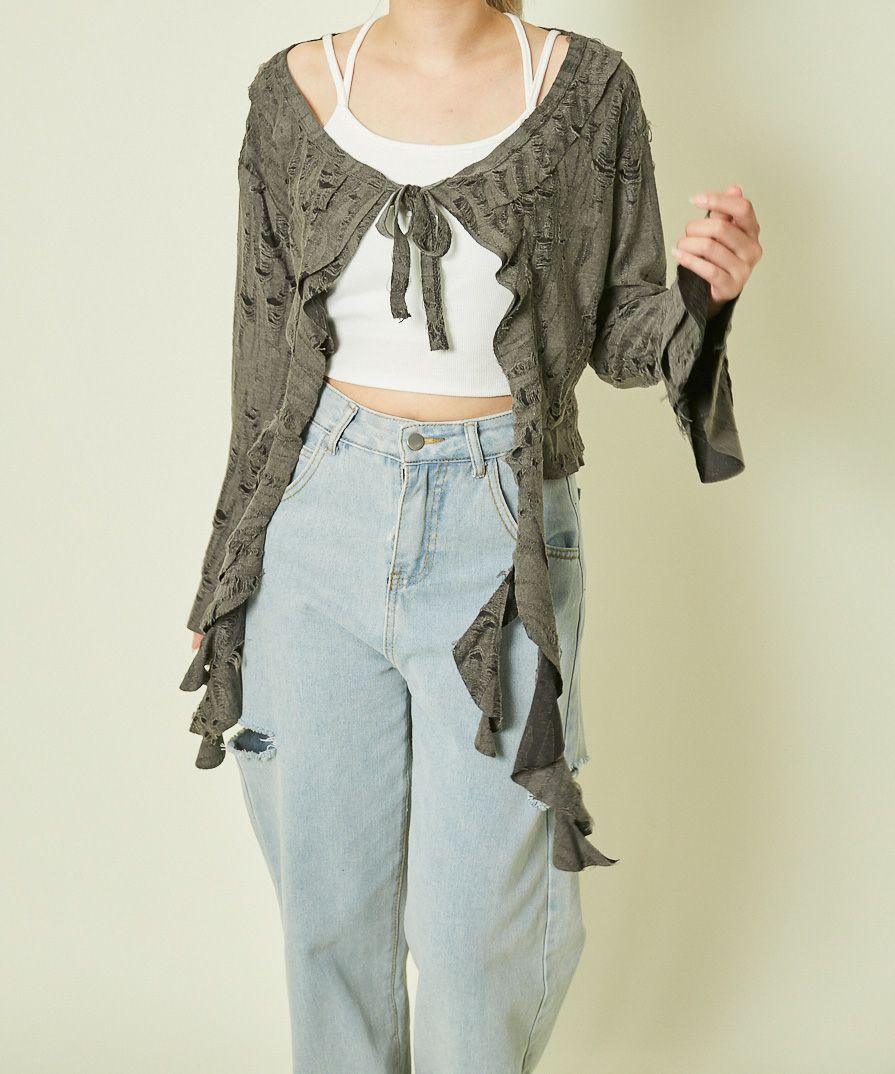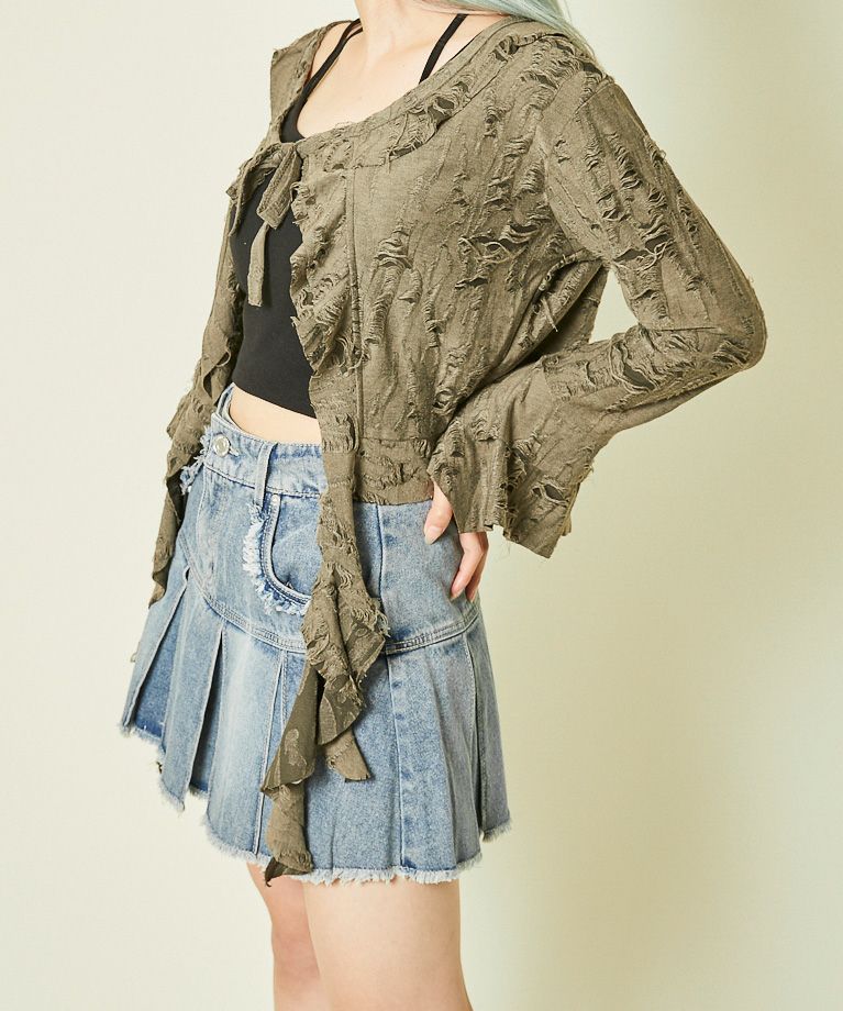 《ダメージ加工×リボン結び》レディース カーディガン クロップド丈 羽織り 春秋