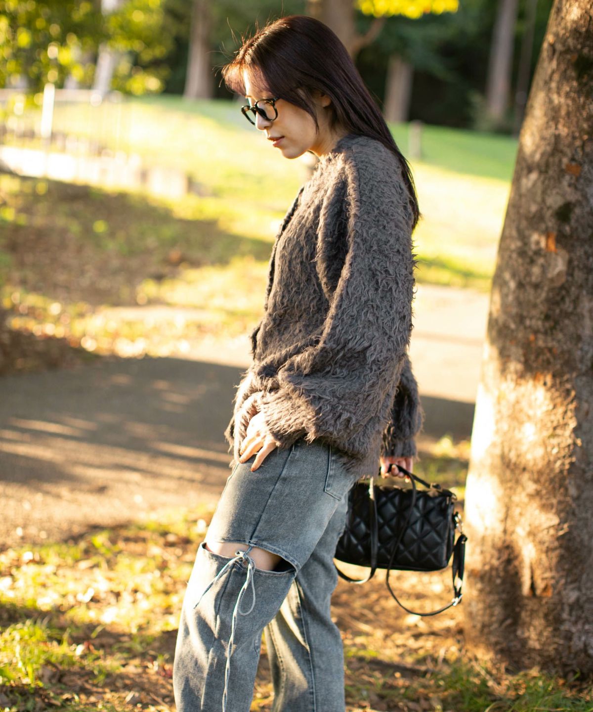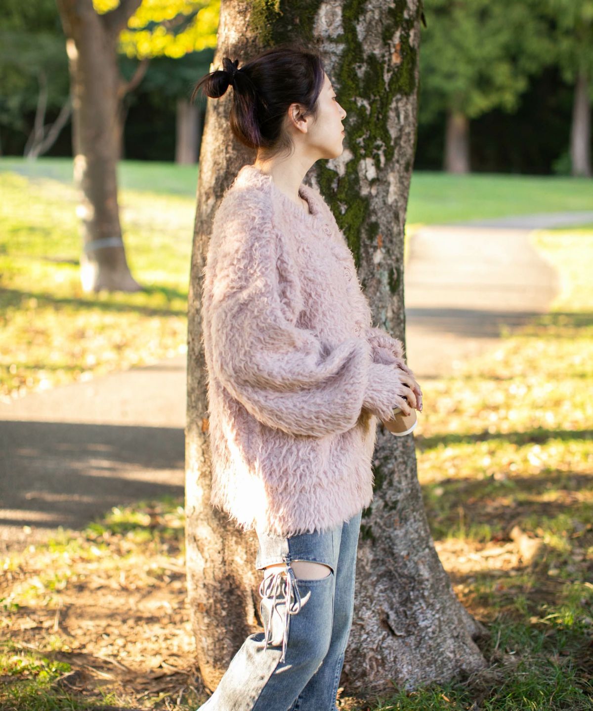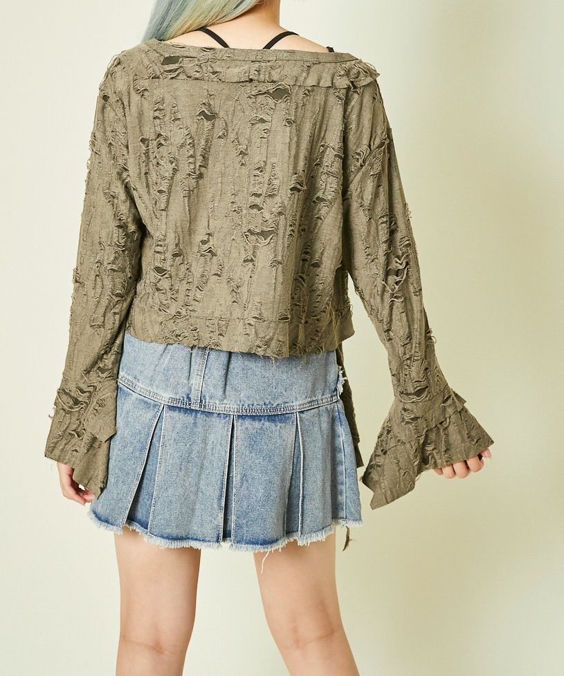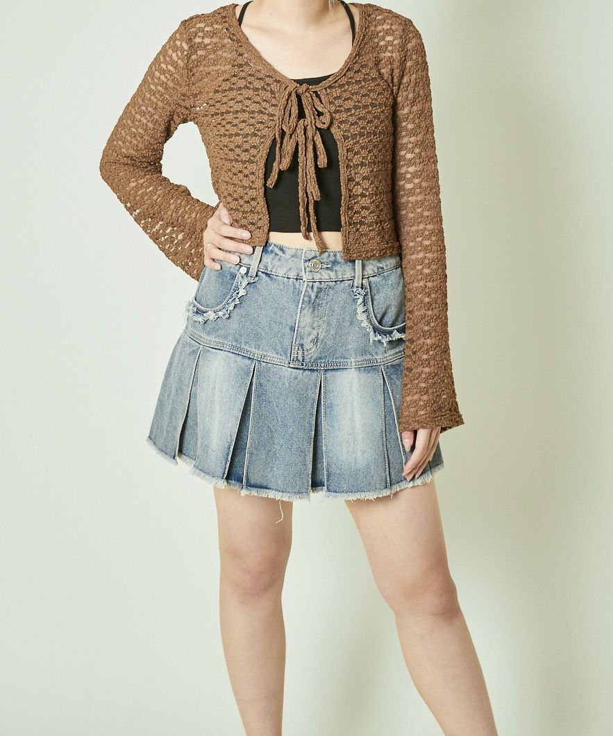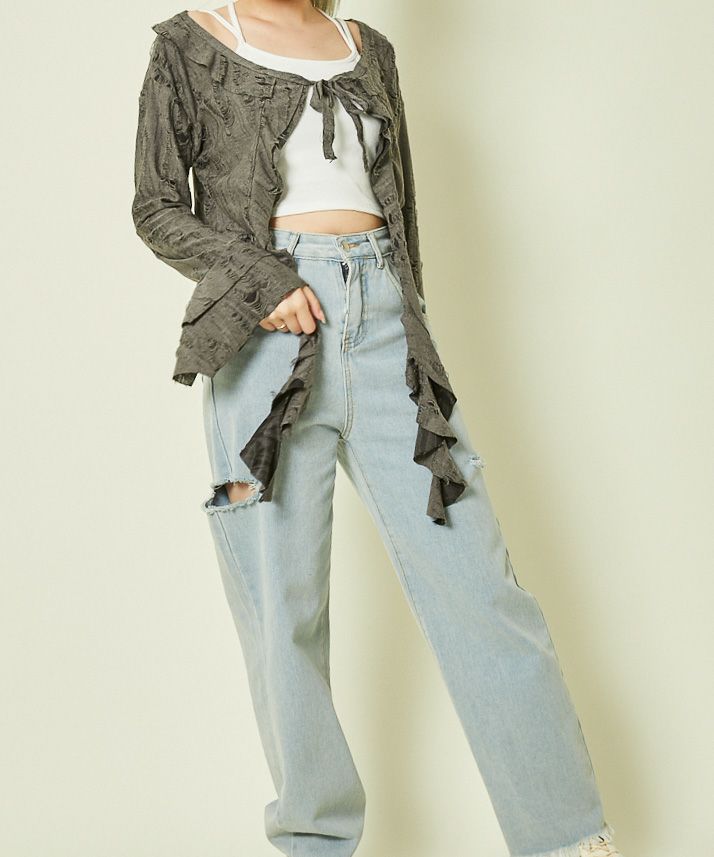 《ダメージ加工×リボン結び》レディース カーディガン クロップド丈 羽織り 春秋