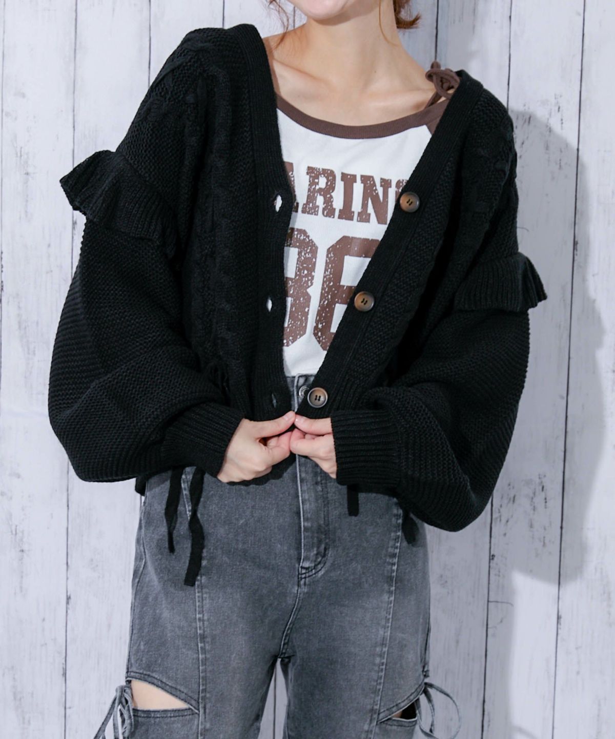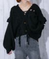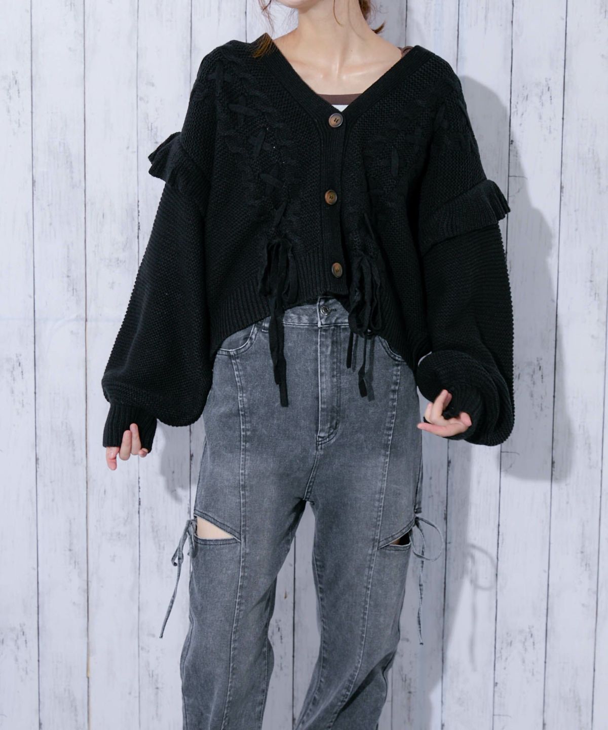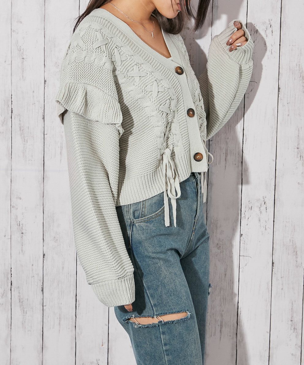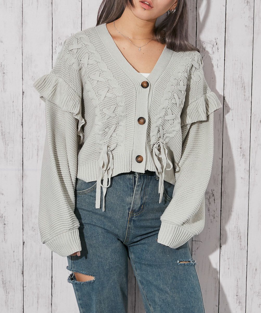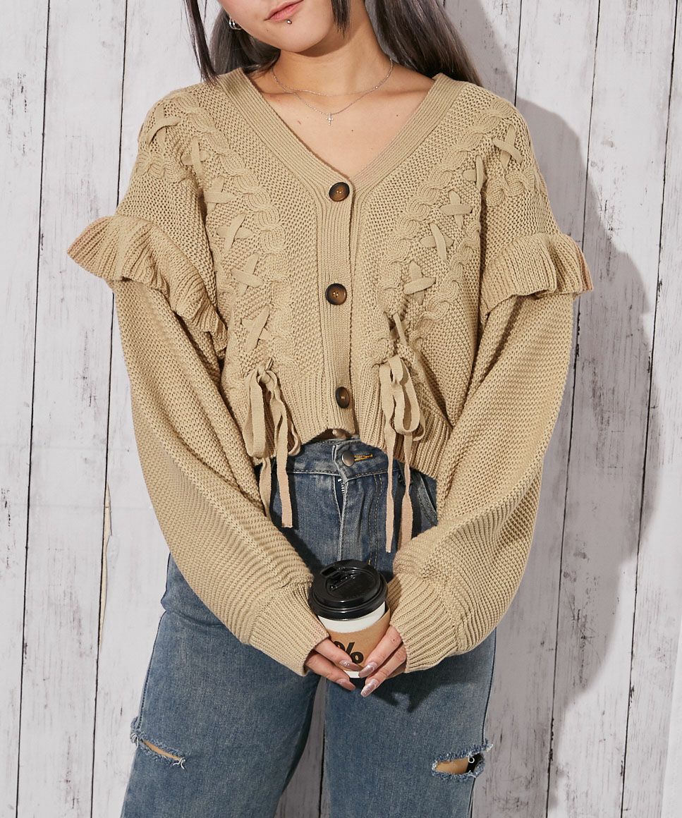 《レースアップ×袖フリル》レディース ニットカーディガン ショート丈 秋冬