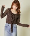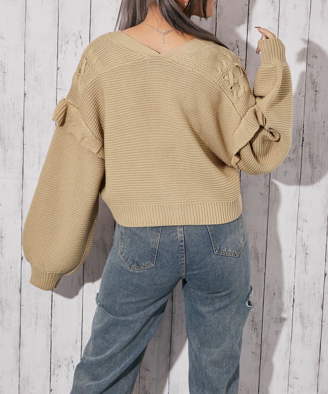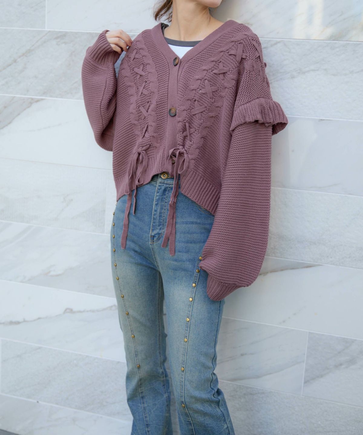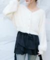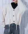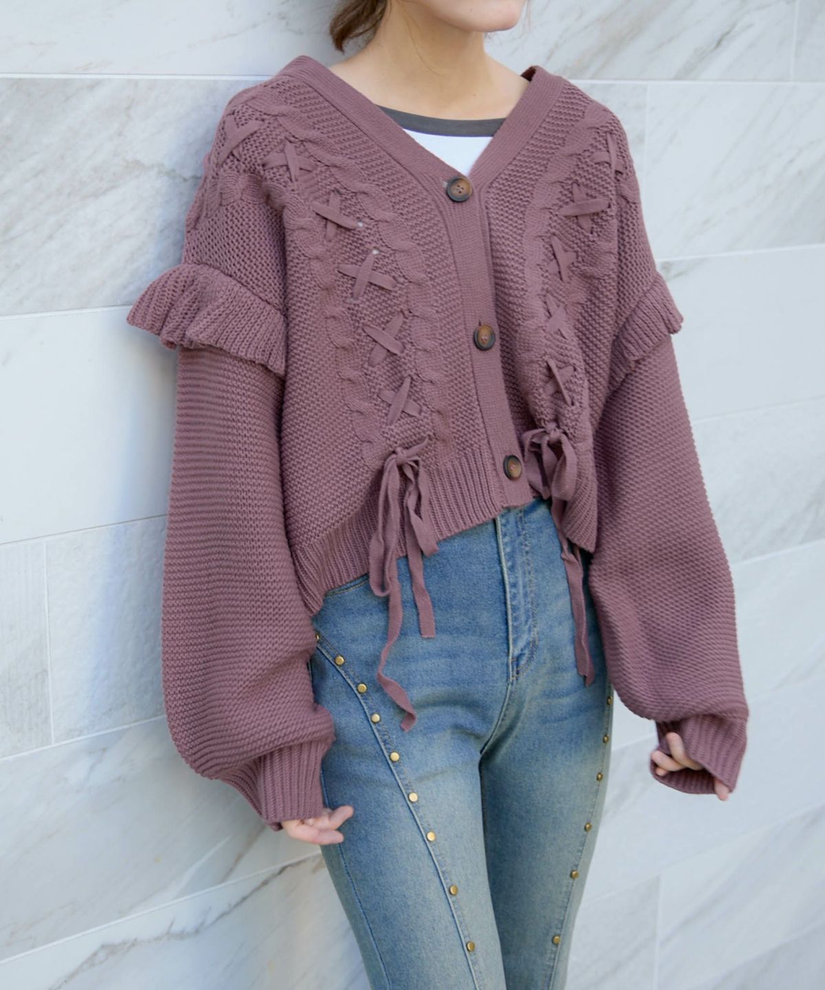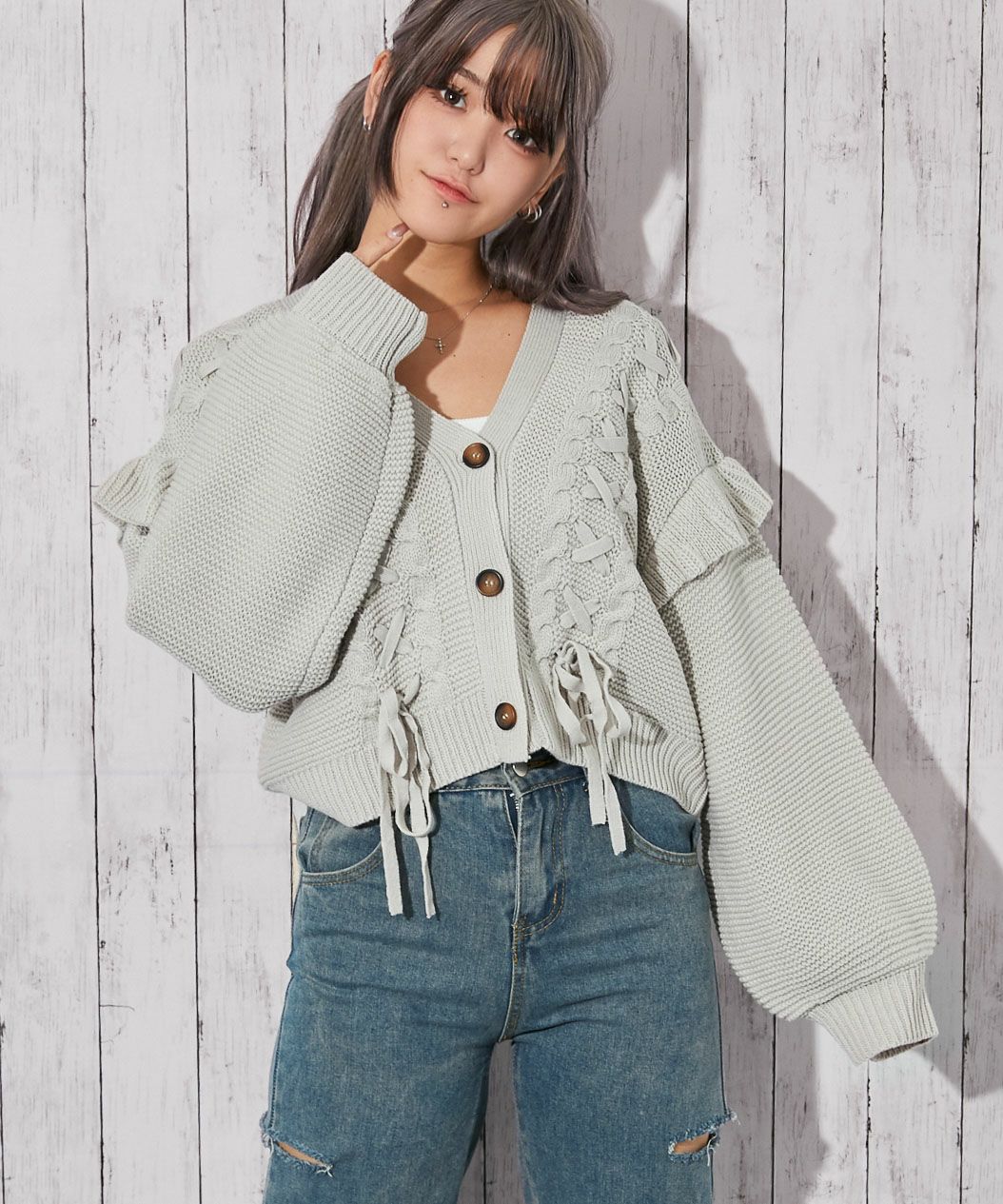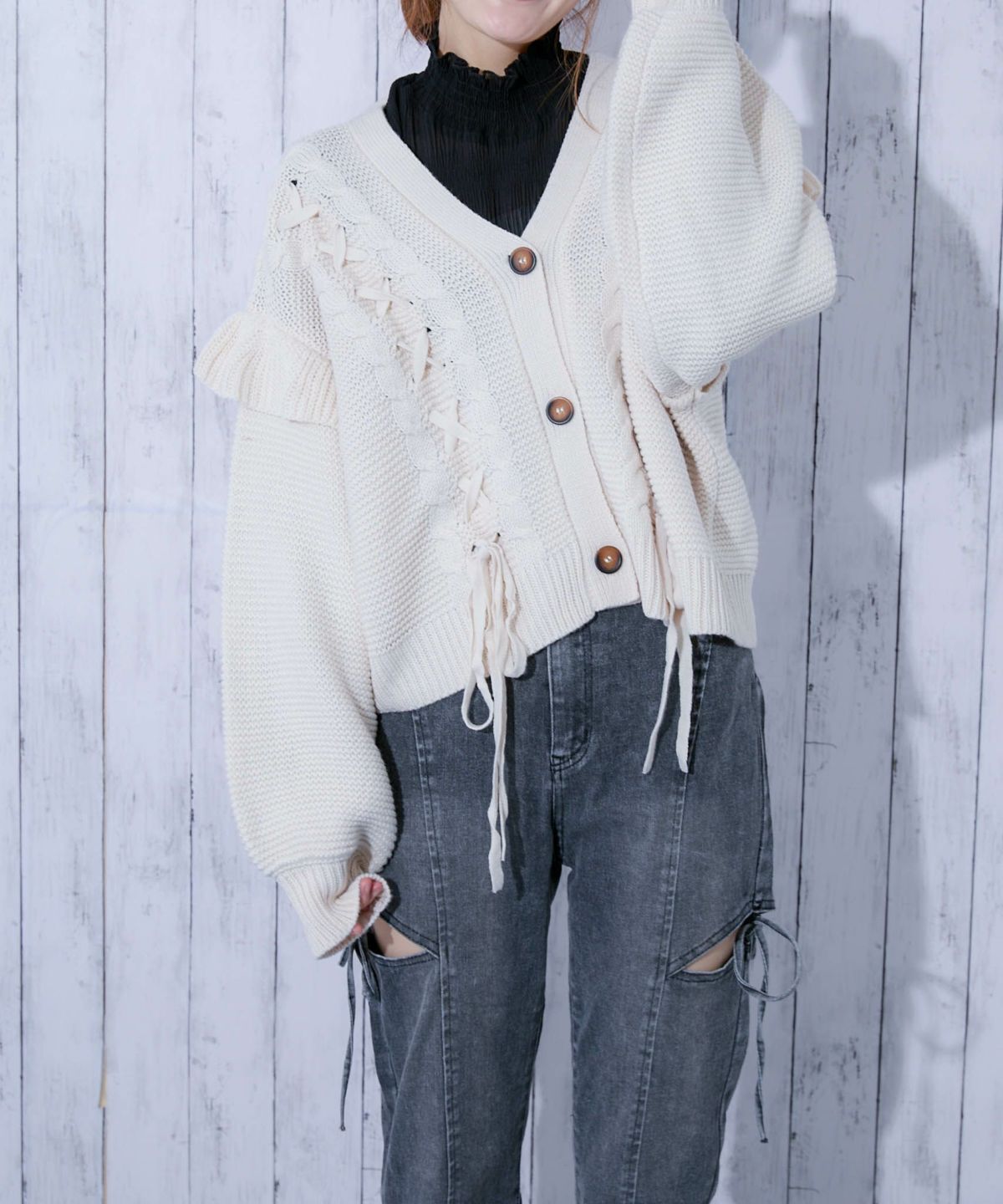 《レースアップ×袖フリル》レディース ニットカーディガン ショート丈 秋冬