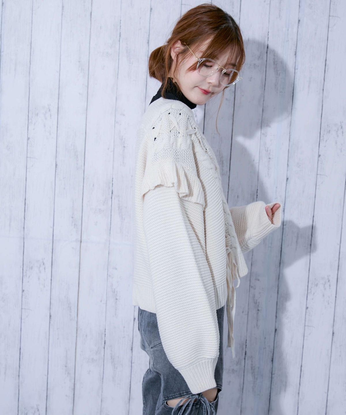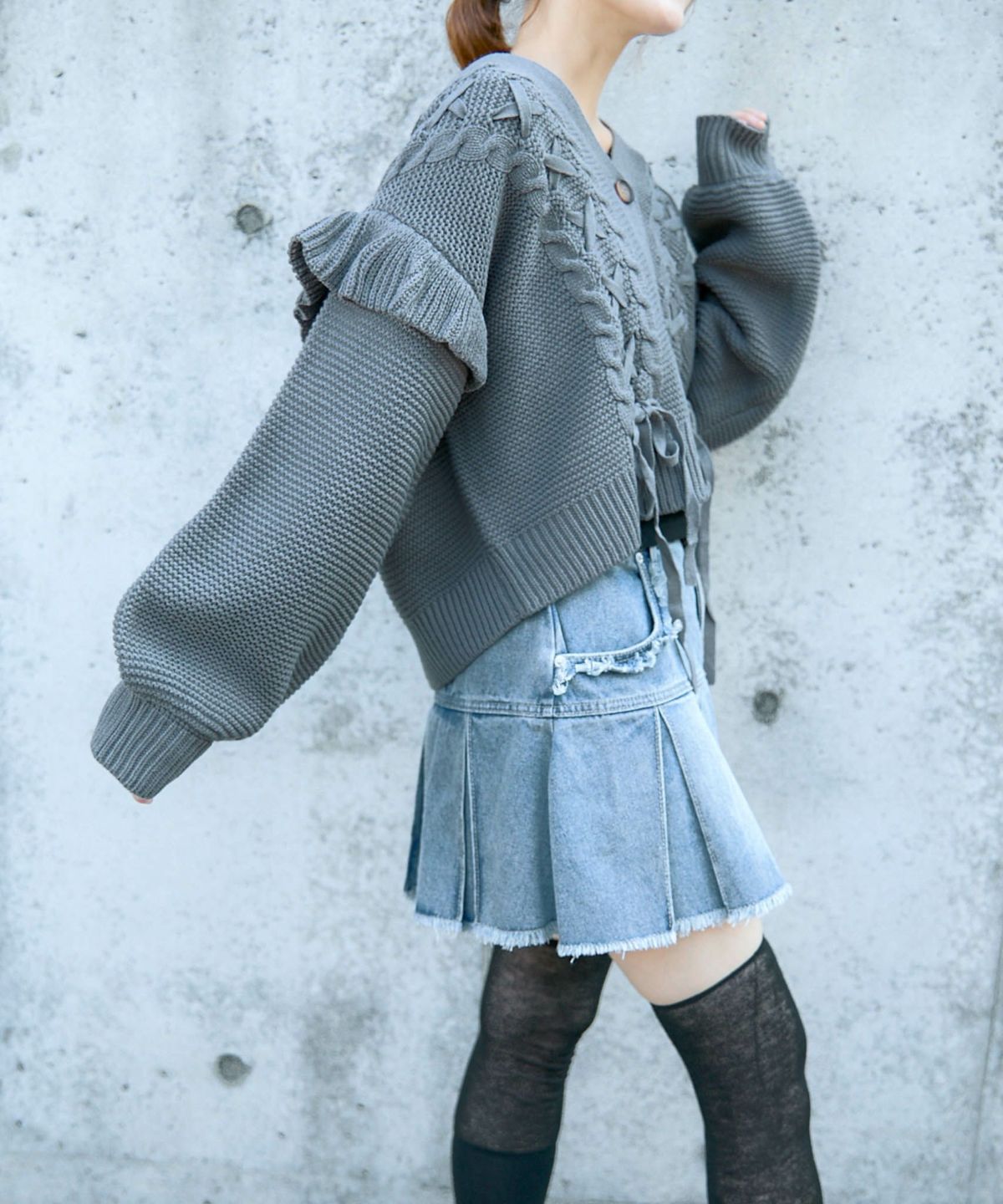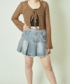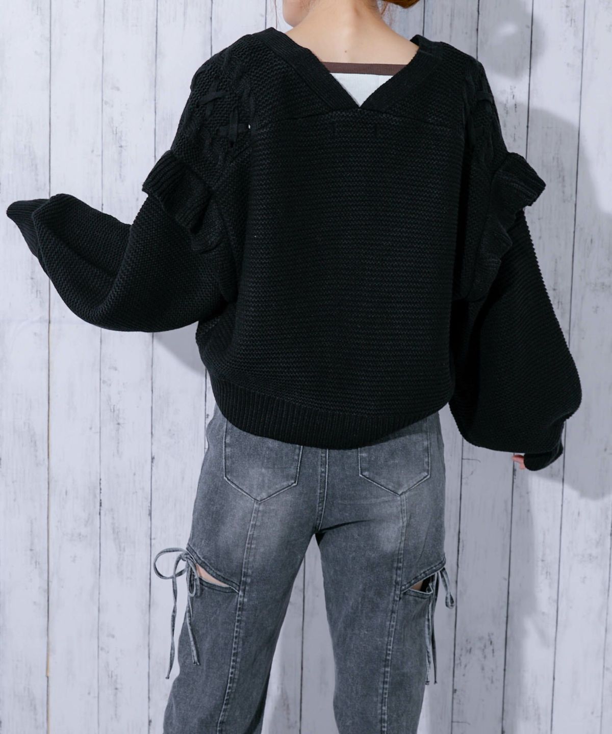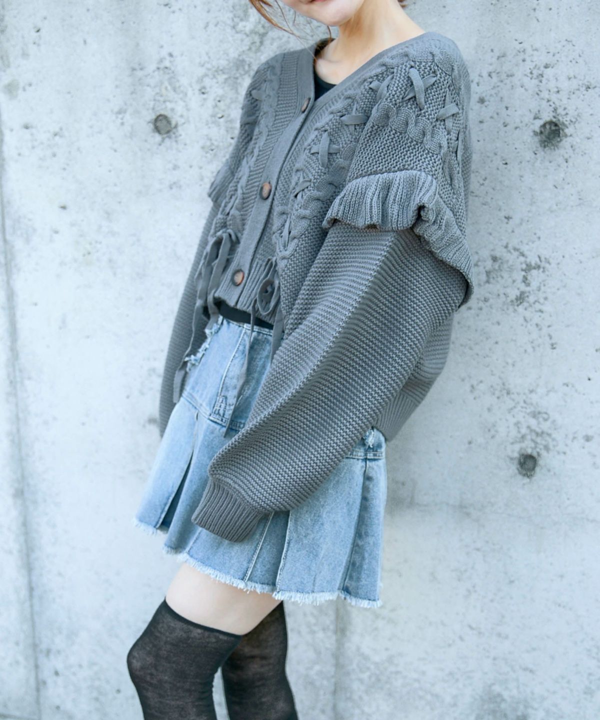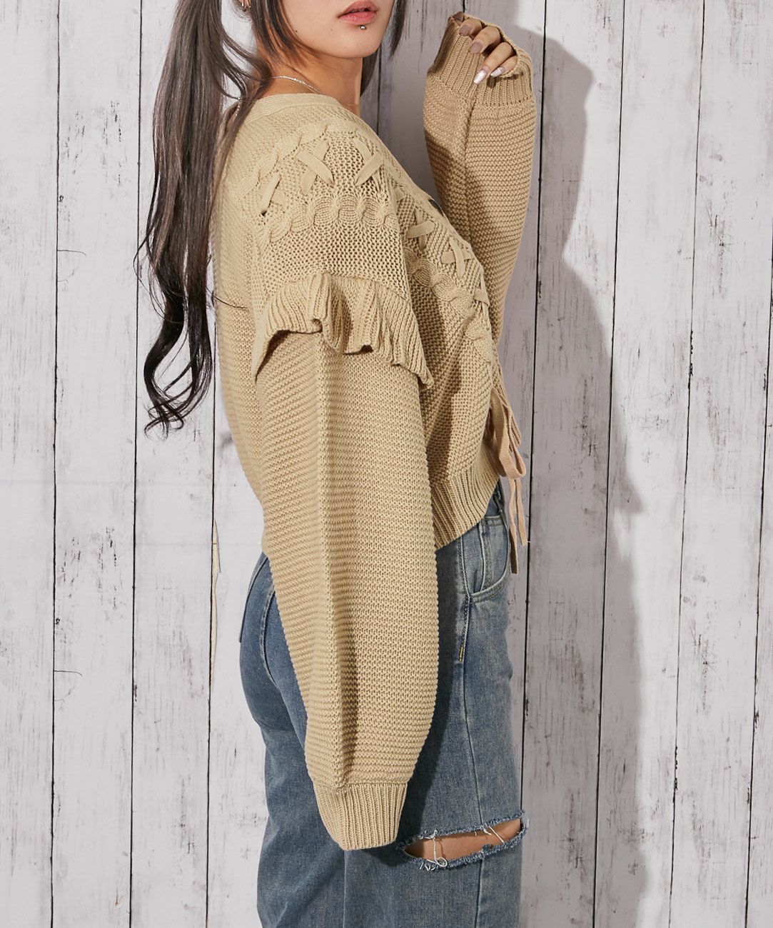 《レースアップ×袖フリル》レディース ニットカーディガン ショート丈 秋冬