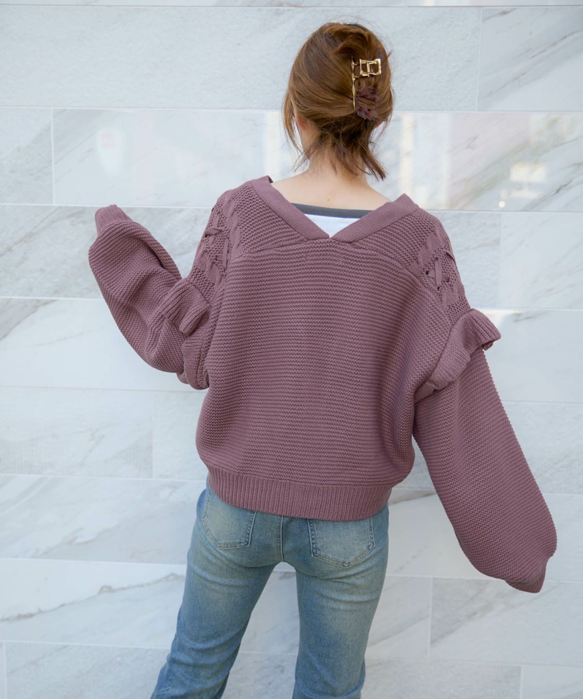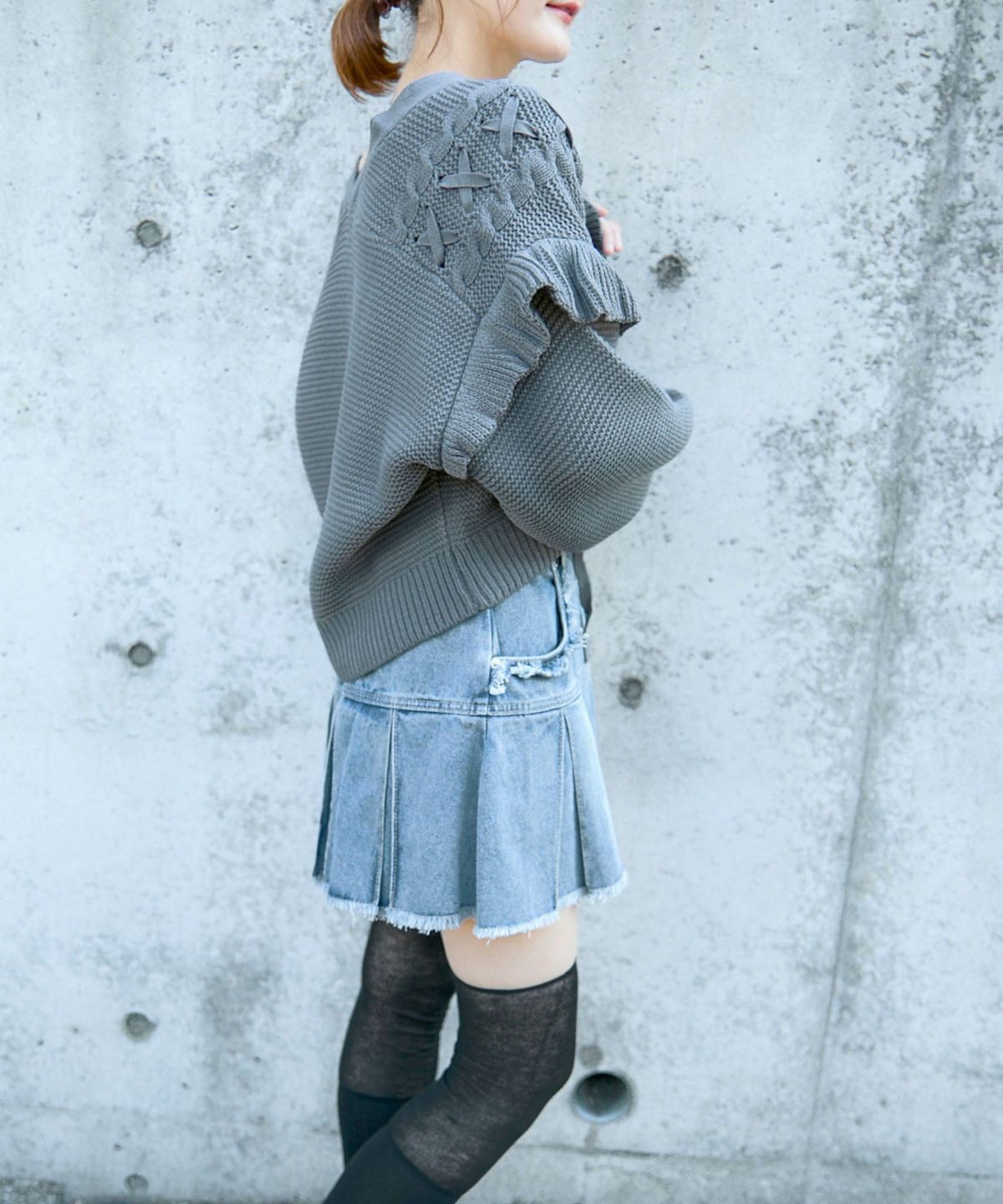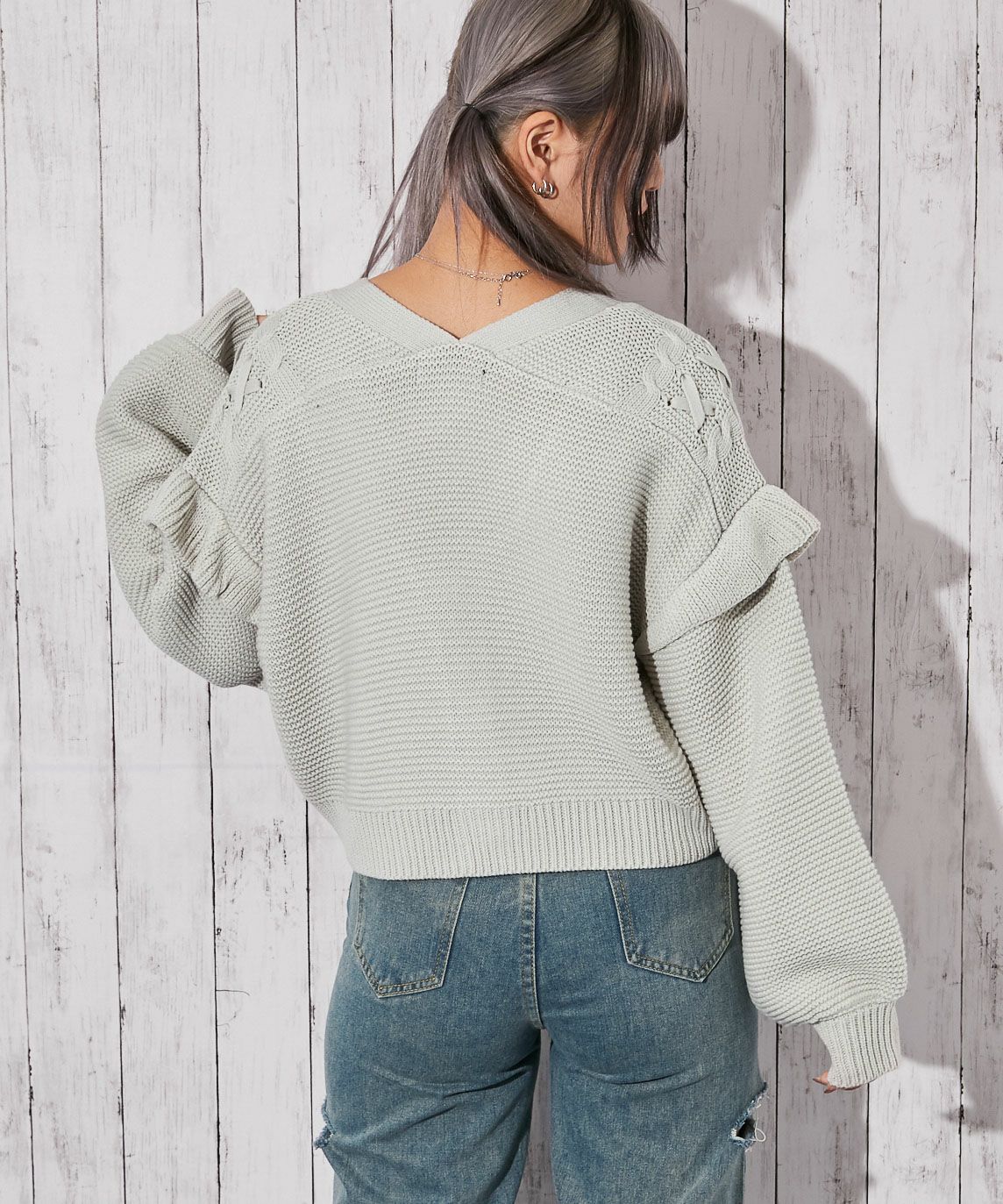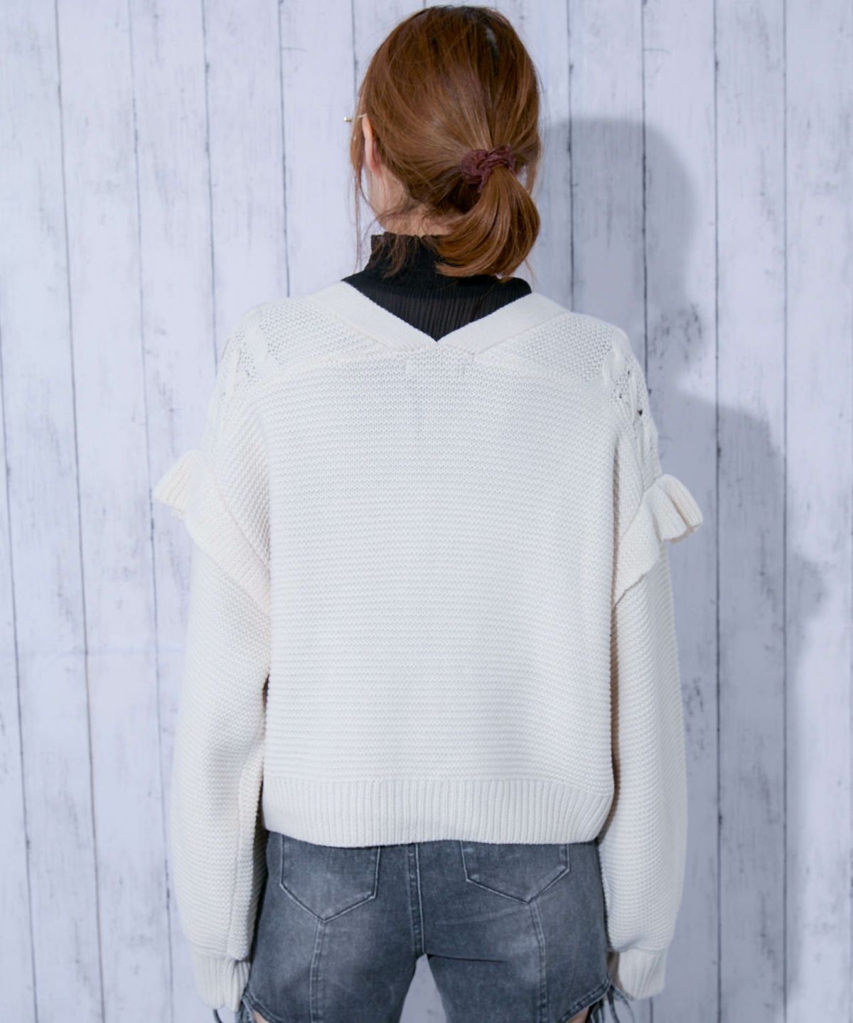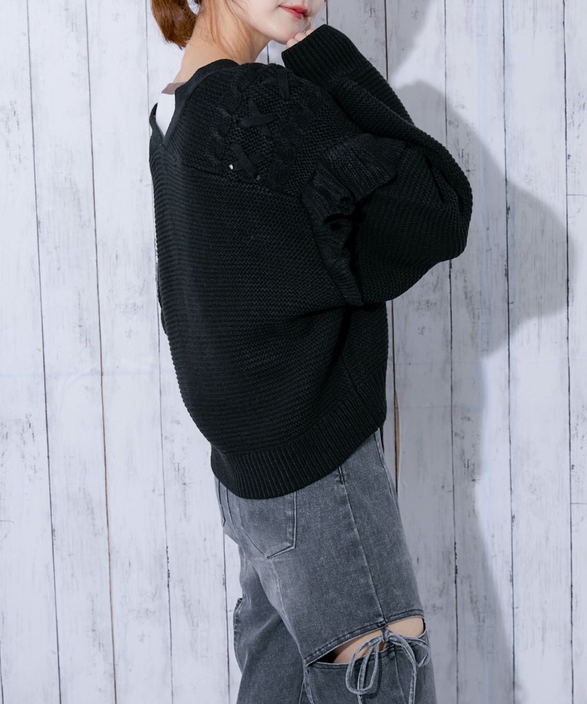 《レースアップ×袖フリル》レディース ニットカーディガン ショート丈 秋冬