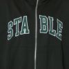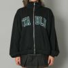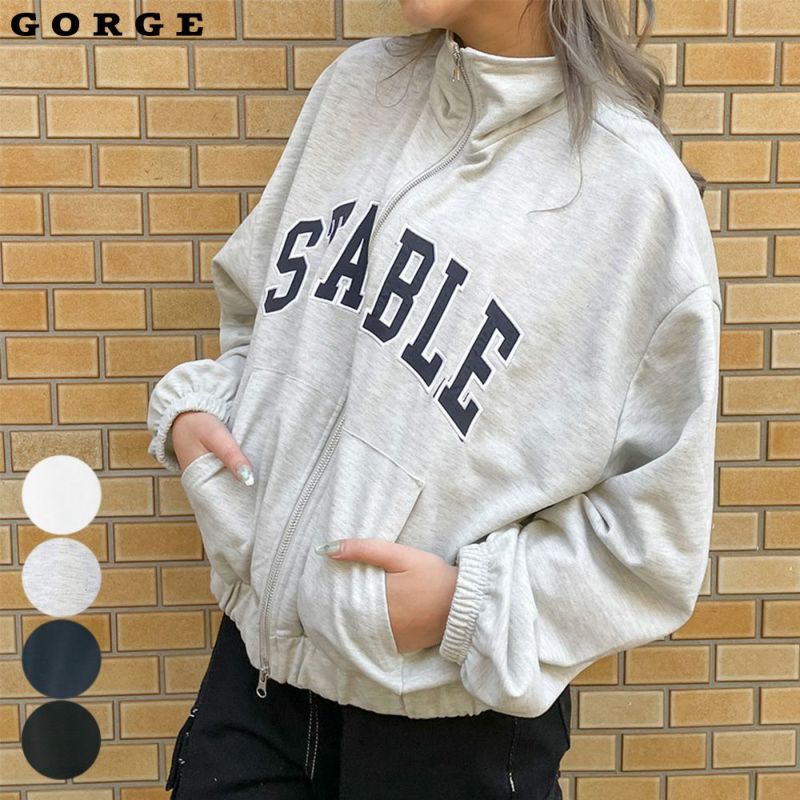 気軽に羽織れるフルジップスタンドネック。フロントにはトレンドのアーチロゴ刺繍で人気のカレッジライクなアクセントをプラス。裾はゴム入りなのでゆるくなりすぎずどんなボトムスとも相性抜群。ジップの開け具合で、襟やインナーを楽しんだり、ハイネック風に着たりと、着方次第で様々なスタイリングを楽しめるのもうれしいポイント。