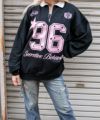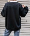 存在感あるナンバリングプリントと配色襟デザインが目を惹く裏毛スウェット。