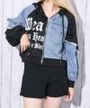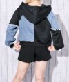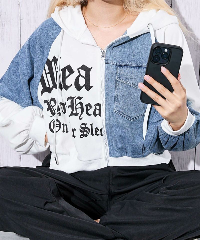 裏毛スウェットとデニムを組み合わせた切替デザインのクロップド丈ジップパーカー。