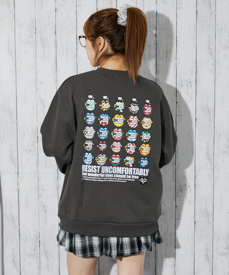 カラフルなリップモチーフが並んだバックプリントが目を惹く裏起毛スウェット。