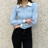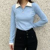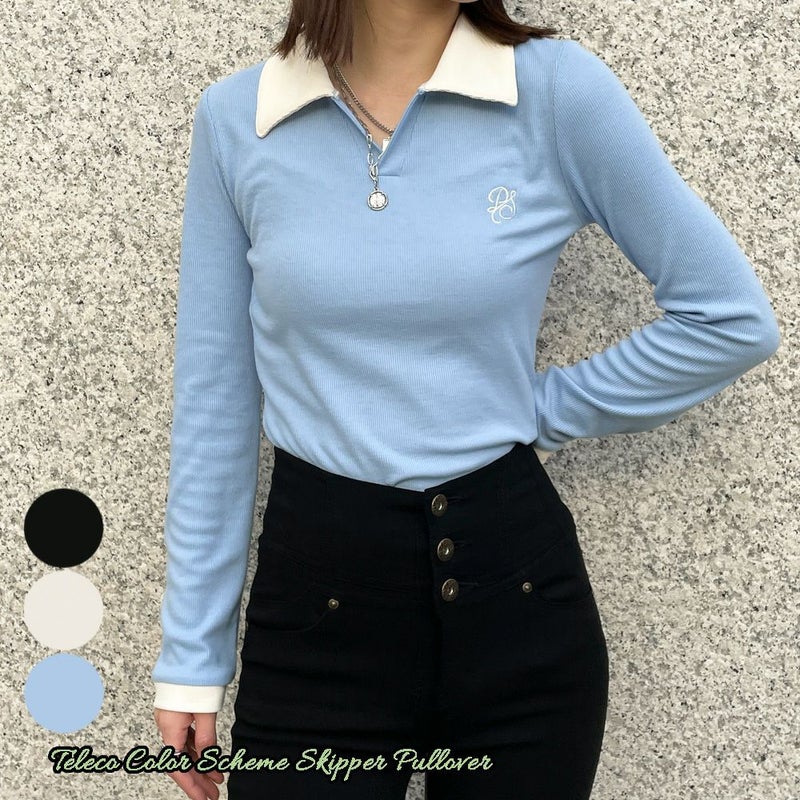 配色がお洒落で可愛いテレコ配色スキッパープルオーバーが登場★柔らかい伸縮性と体のラインにすっきりするフィット感が魅力のテレコ編み生地♪配色の襟と袖口がアクセントになって大人っぽい印象の一枚◎タイトに着れてキレイめ大人カジュアルに仕上がります☆