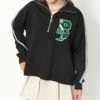 袖のライン使いがスポーティな雰囲気のハーフジップトップスが登場★ラフな着こなしを叶えるビッグなシルエットでトレンドコーデが完成♪フロントには大きな刺繍ロゴでアクセントをプラス◎1枚ではもちろん、インナーにロンTなどを合わせてシーズン長く着回せます☆