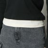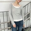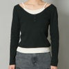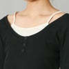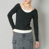 キャミレイヤード風のデザインが女性らしい印象のトップス。さり気ない肌見せができ女性らしい印象を与えてくれる。スラックスと合わせたきれいめコーデや、デニムと合わせてカジュアルになり過ぎず女性らしい着こなしもオススメ◎