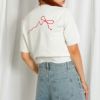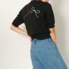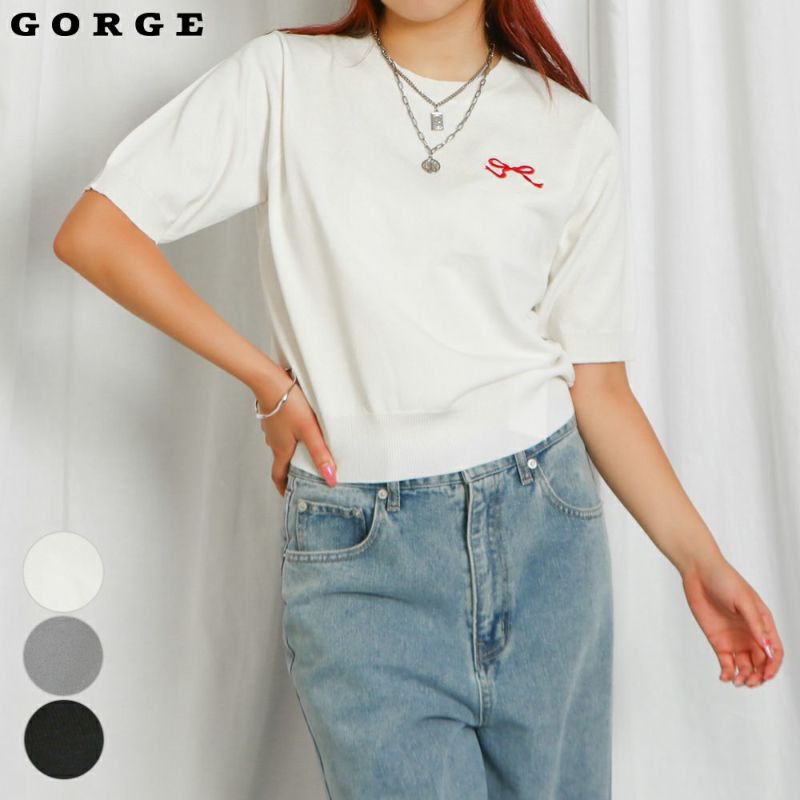 程よくボリュームのあるスリーブ袖とミニマルなシルエットのバランスが女性らしい半袖ニット。伸縮性があり、リラックスした着心地も魅力的◎愛らしいリボン刺繍が前後に施され、シンプルなコーデに差し込むだけでワンランク上のバレエコアルックを叶える♪