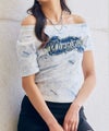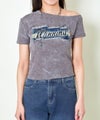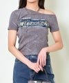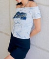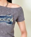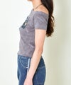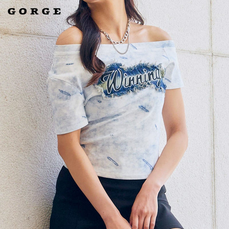 フェミニンさとストリート感を絶妙にミックスした、オフショルダー仕様のデニムワッペン付きTシャツが登場♪