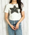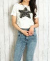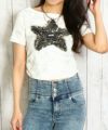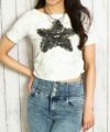 デコルテラインを綺麗に見せるオフショルダー仕様で、女性らしさをさりげなくアピール。胸元の星ワッペンは、重なり合うデニム素材とダメージ加工により立体感と深みがあり、クールさと遊び心がミックスされた印象に♪