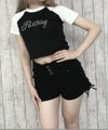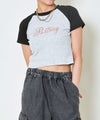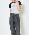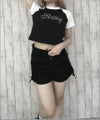 コンパクトな丈に、中央に施されたラインストーンのロゴがアクセント。キラキラと光を反射するラインストーンは、動くたびにさりげなく存在感を放ち、コーデ全体に華やかさをプラスしてくれます。