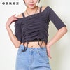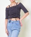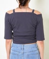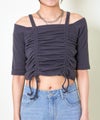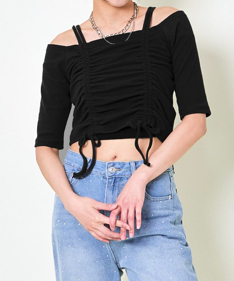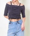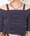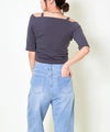 オフショルダー×ドロストデザインが目を引く、旬顔トップスが登場!やわらかなテレコ素材で着心地も抜群。程よく身体にフィットするシルエットが、フェミニンさとヘルシーな魅力を引き立ててくれる一枚です?