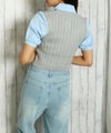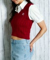 シャツ部分はハリ感のある生地を使用し、清潔感たっぷりの印象に。袖はふんわり丸みを帯びたパフスリーブ仕様で、フェミニンさをひとさじプラス。ニットベストは立体感のあるケーブル編みで、温かみのある表情を演出します。フロントに小さく入ったロゴ刺繍がさりげないアクセントに。