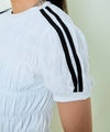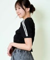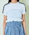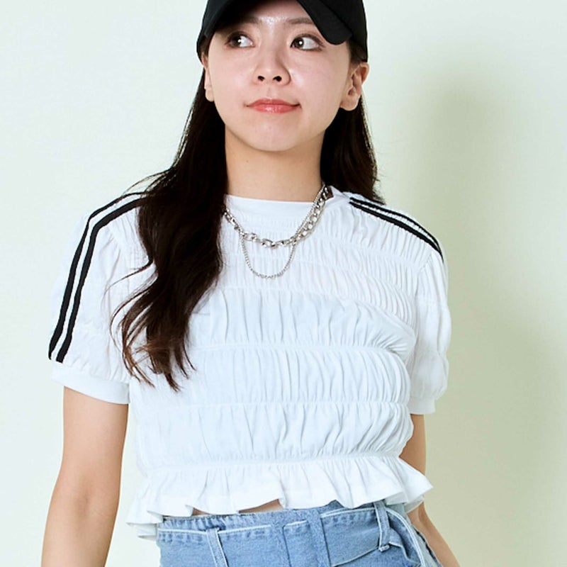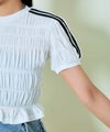 シャーリングが印象的で、立体感のあるフォルムを演出。ボディラインに程よく沿いながらも、リラックス感のある着心地が魅力です。さらに、袖部分に施されたラインがアクセントとなり、スポーティーなエッセンスをプラス。シンプルな中にも遊び心が光るデザインで、1枚でサマになるのがポイントです。素材感もさらりとしており、ロングシーズン快適に着用できます。