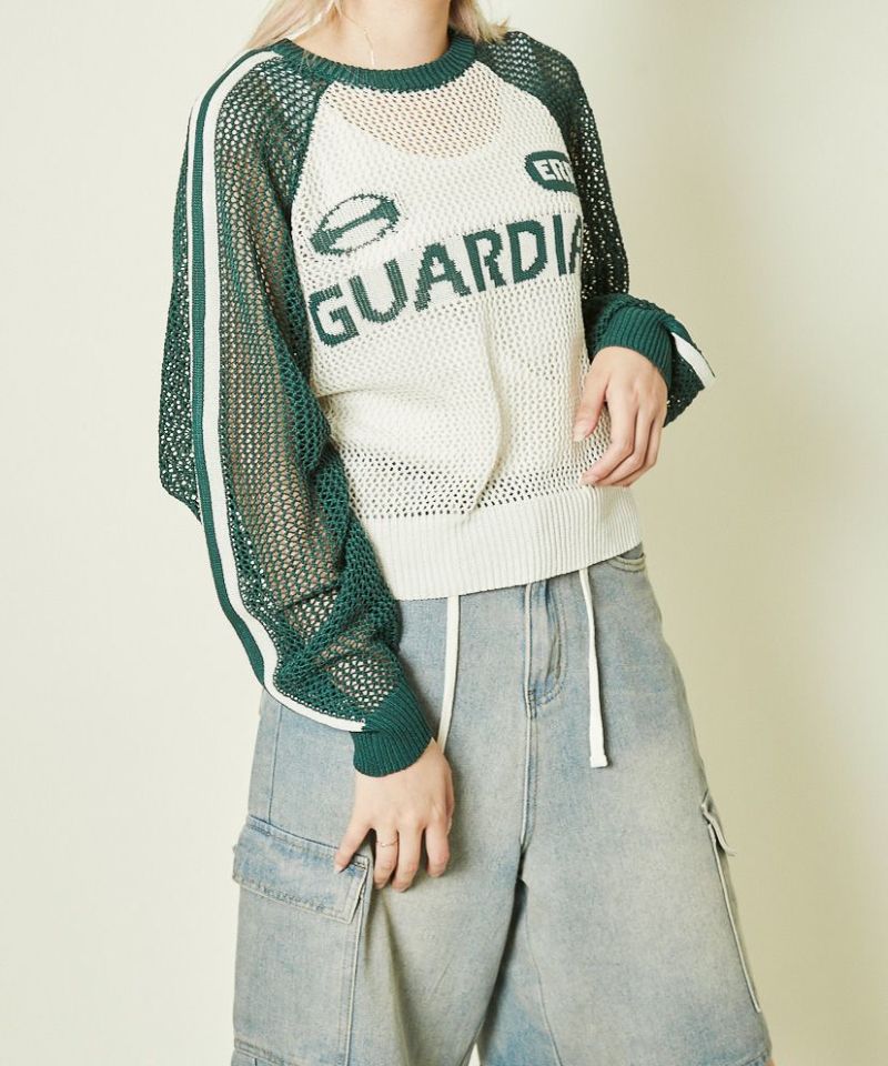 スポーティなムードと抜け感がちょうどいい、メッシュラインニットプルオーバー。