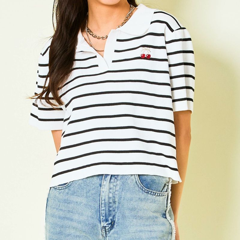 フェミニンさとカジュアル感を絶妙にミックスしたチェリー刺繍スキッパーニット