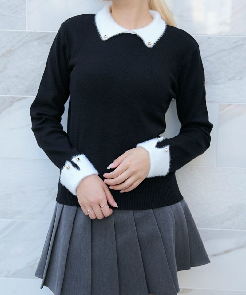 ふわっとしたフェザー素材の襟と袖口がポイントになった、フェミニンなニットプルオーバー。