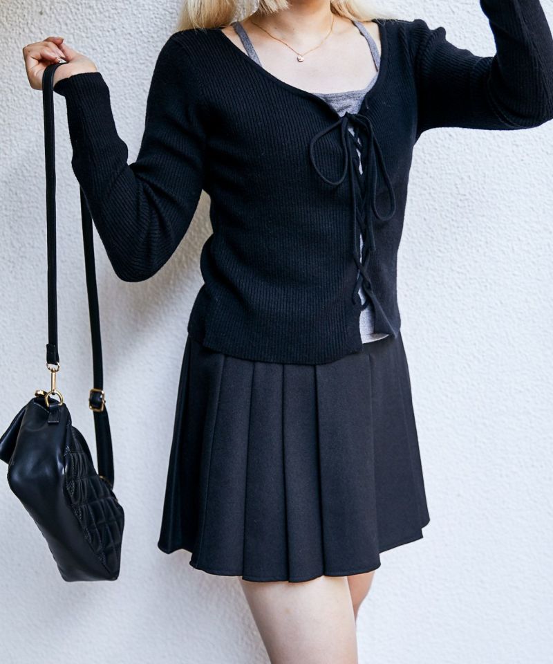 フロントのレースアップとフェイクレイヤード風キャミソールドッキングがポイントのリブニットトップス。スタイリング要らずでトレンド感を演出してくれる万能アイテムです。
