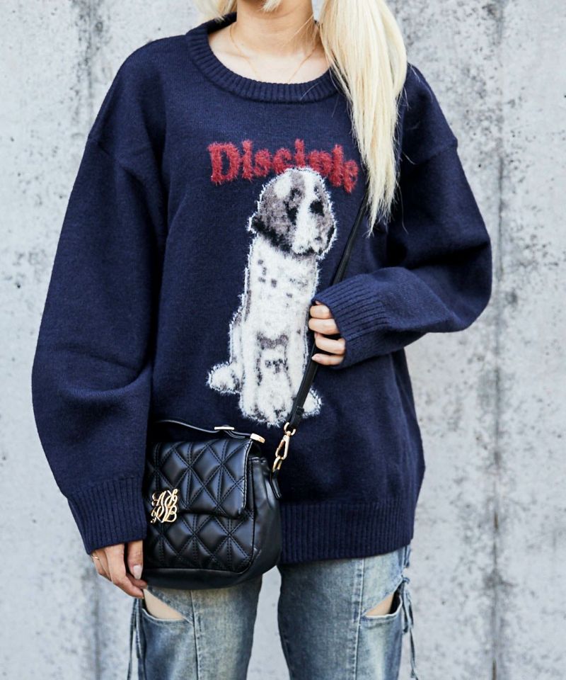 フロントに存在感のある犬プリントとロゴを施した、遊び心たっぷりのニットプルオーバー。着るだけでコーデの主役になる映えアイテムです。