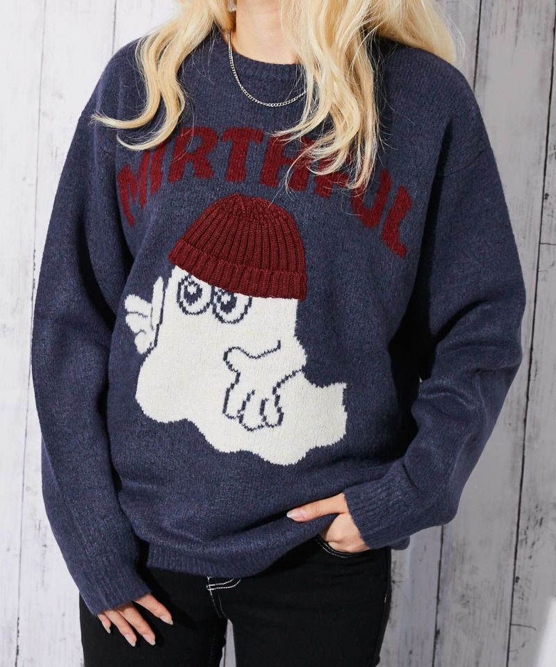 ニット帽をかぶったゆるかわおばけが目を惹く、遊び心たっぷりのデザインニット。