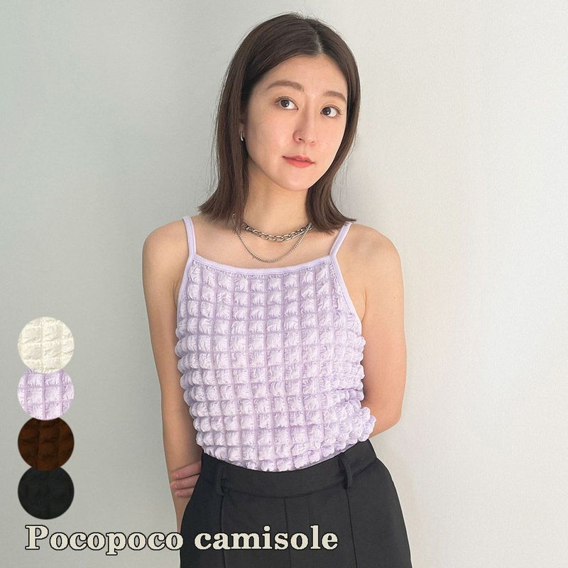 あのポコポコデザインのシリーズからパッと目を惹くキャミソールが登場★立体感のある凹凸がボリューミーでインパクト大♪キャミソールを活かしたボレロやシャツ合わせが今時感UPなコーデ◎印象的なキャミソールトップスでトレンドを先取り☆