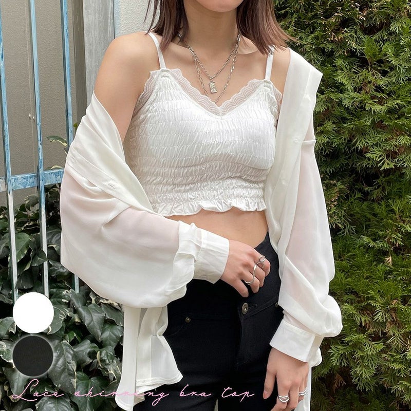 女の子らしいルックスがかわいいレースシャーリングブラトップが登場★たくさんのシャーリングでフェミニンなアイテム♪インナートップスとしてのインパクトがあるのでコーデに輝きを持たせてくれる◎シャツやアウターを羽織るスタイルもオススメ◎小ぶりのネックレスとも相性が良く、様々なファッションアプローチがかけられます☆