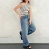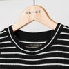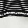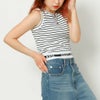 裾のロゴがポイントのボーダーニットタンク。しなやかにボディーラインに沿うシルエットで、女性らしい着こなしを叶えてくれます。ショート丈のデザインでデニムやワイドパンツと合わせても可愛い☆レイヤードスタイルのインナーとしても◎