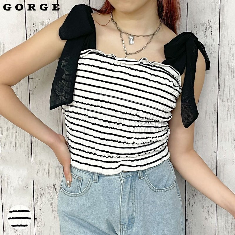 トップス ブラトップ 春 夏 リボン ボーダー プチプラ 韓国ファッション 2427717