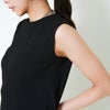 リブ特有の縦ラインが強調され、すっきりとしたシルエットを演出。体のラインを程よく拾いながらもピタッとしすぎず、抜け感のある絶妙なフィット感です。ネックラインやアームホールの開き具合も計算されており、女性らしい印象を引き立てます。