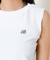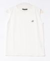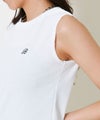 無地のタンクトップに控えめな刺繍がワンポイントで施されており、シンプルながらも程よくおしゃれな印象を演出します。丈の長さも絶妙で、タックインしてもアウトで着てもバランスよく決まります。カジュアルながらも上品さを感じさせるデザインが特徴です。