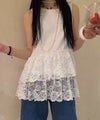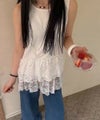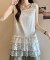 上身頃は体に優しくフィットするテレコ素材で、女性らしいシルエットに。ウエスト切り替えからふんわり広がる2段レースが甘すぎず、軽やかな抜け感を演出します。動くたびにふわっと揺れるレースが、視線を引きつけてスタイルアップ効果も◎デコルテラインはベーシックなクルーネックで、どんなアウターとも合わせやすい万能さも魅力です。