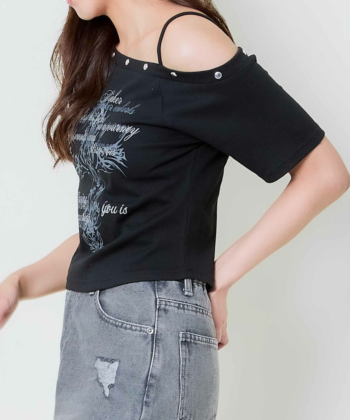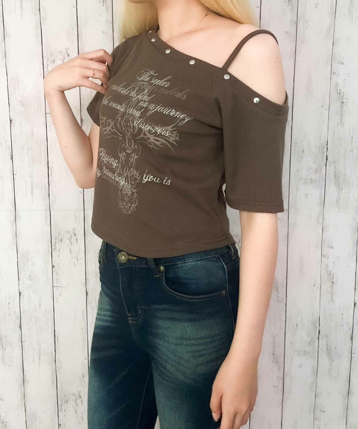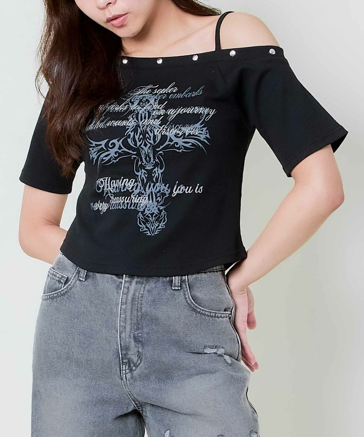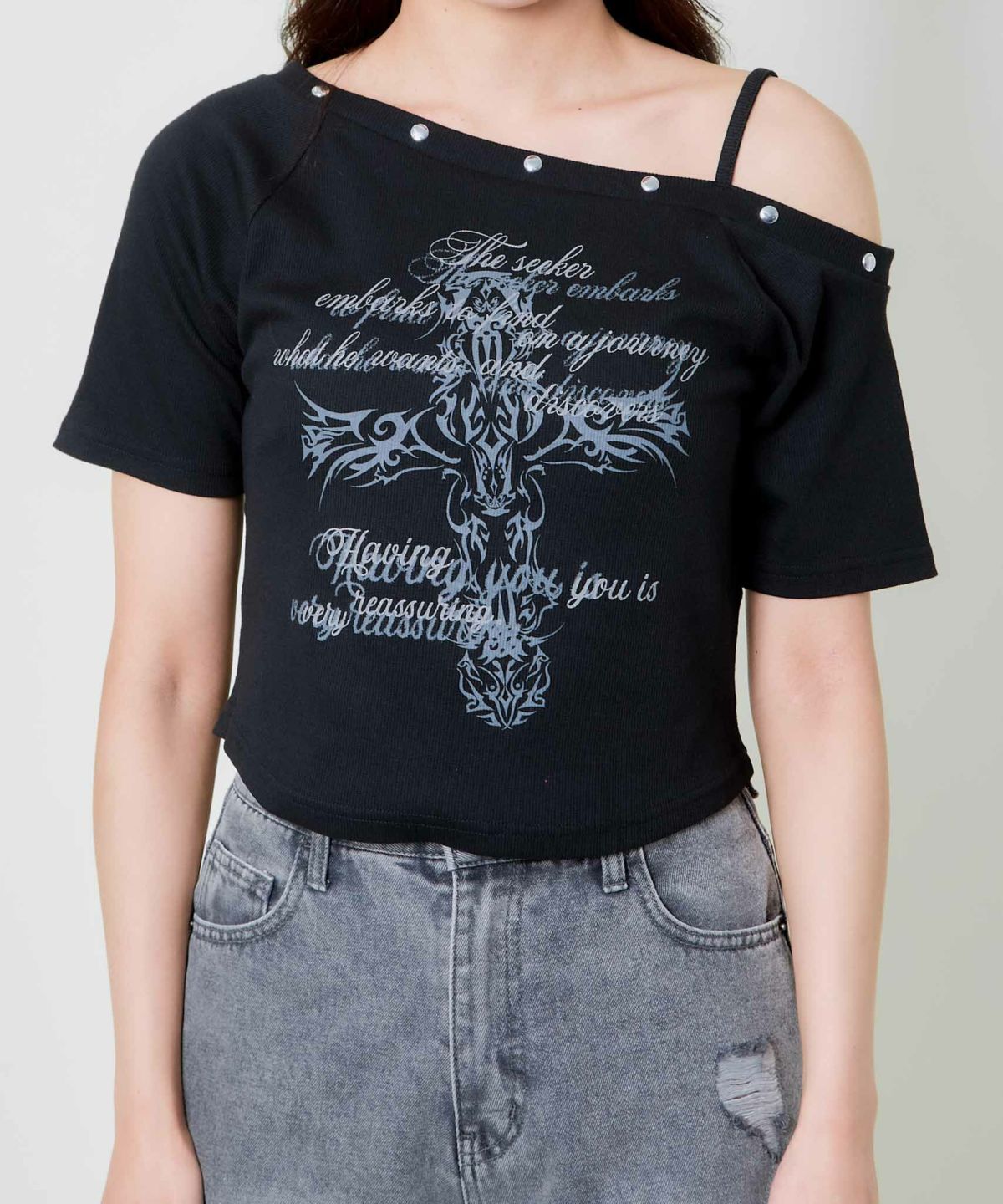 他の画像を見る 《クロス風プリント×ワンショルデザイン》レディース Tシャツ 春夏秋 スタッズ付き 2BUY10%OFF 定価 ¥ 4,389 のところ SALE価格 ¥ 1,419 税込 カートに入れる お気に入りに登録する