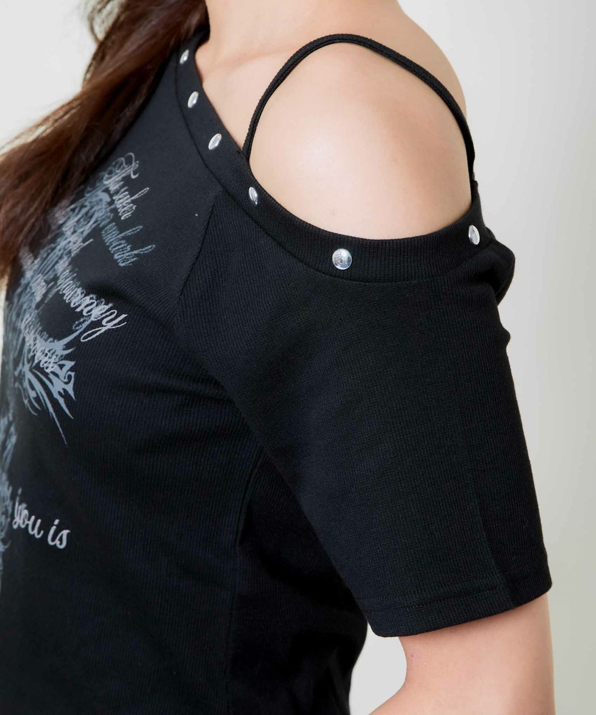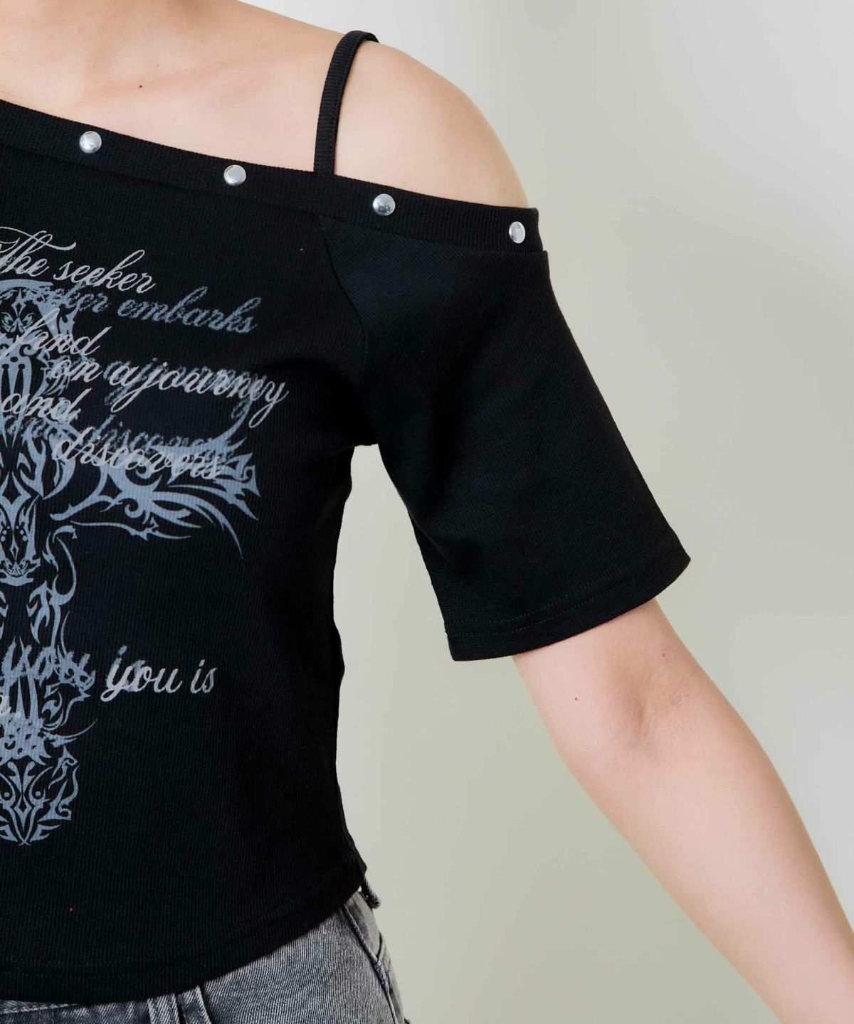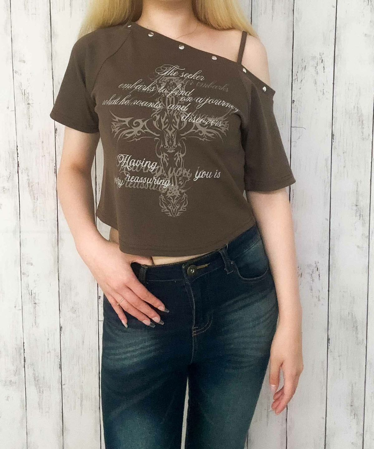 他の画像を見る 《クロス風プリント×ワンショルデザイン》レディース Tシャツ 春夏秋 スタッズ付き 2BUY10%OFF 定価 ¥ 4,389 のところ SALE価格 ¥ 1,419 税込 カートに入れる お気に入りに登録する
