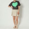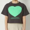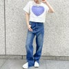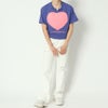 ハート型にエンボス加工がされた可愛いTシャツが登場★目を惹く個性的な配色がポップで甘くなりすぎないアイテム!デニムと合わせたカジュアルなコーデがオススメ☆絶妙な丈感でハイウエストのボトムとの相性抜群◎スタイルアップ効果も期待できます♪
