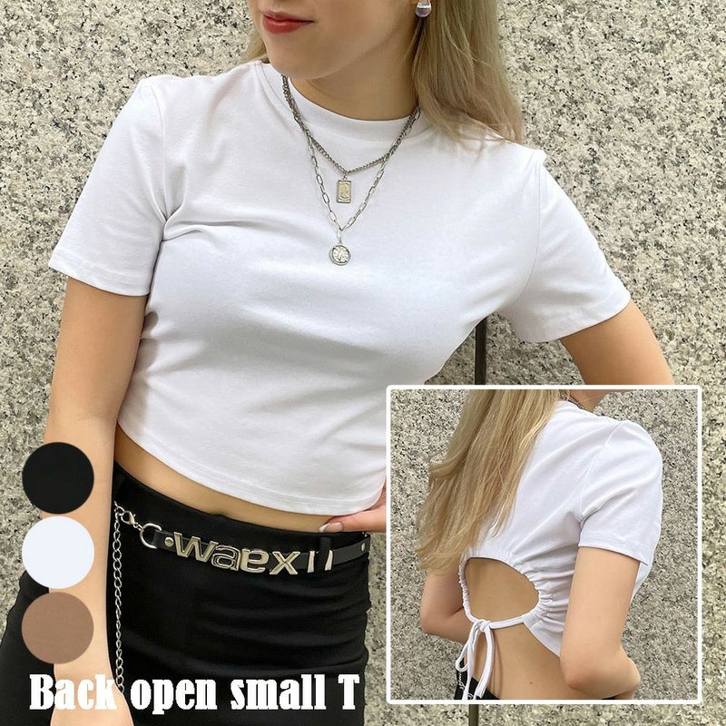 バックシャンデザインがおしゃれなバックオープンTシャツが登場★ざっくりと開いたバックデザインで、レイヤードスタイルを楽しめる1枚♪ラフに着られるカットソー素材も嬉しいポイント◎ワイドなボトムとメリハリをつけたり、スキニーパンツと合わせてボディラインを出したり、いろんな着こなしが出来ます☆