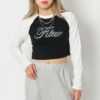 配色のラグランデザインがアクセントとなった、1枚で決まるクロップド丈のロンTが登場★フロントにあしらったラインストーンのロゴがレディなアクセントを添えるアイテム♪コンパクトなサイズ感で女性らしいシルエット◎デニムはもちろん、カーゴパンツやショートパンツとの相性がよくストリートからカジュアルまで幅広く着ていただけます☆