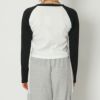 ハートとロゴのデザインがY2KファッションにハマりやすいラグランTシャツに長袖が登場★クロップド丈のラグランがストリートスタイルにピッタリなアイテム♪ピッタリとタイトなシルエットなのでゆったりしたボトムと合わせるとスタイルアップ効果抜群◎トレンドのカーゴパンツと合わせたりミニスカート合わせがオススメです☆