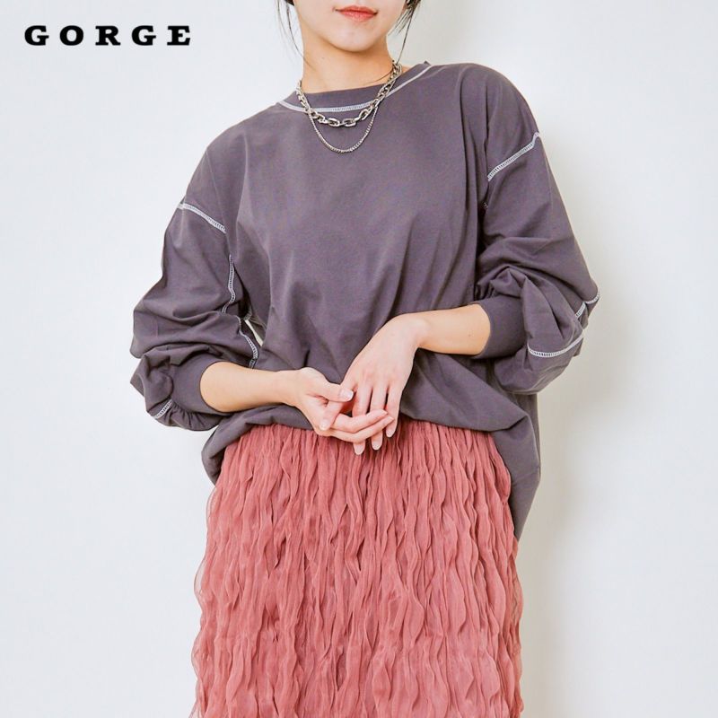 シンプルなロンTに施されたステッチが、さりげなくも印象的。袖口や裾のステッチがデザインのポイントとなり、無地でもこだわりを感じさせる一着です。