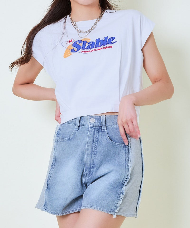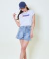 胸元にあしらわれたハリツケ風のロゴは、ポップな配色と立体的なデザインが印象的。目を引くデザインながらも派手すぎず、コーデのアクセントにぴったり。タック入りのシルエットで、ボディラインを拾いにくく快適な着心地を実現。ラフすぎず、ほどよくきれい見えする仕上がりです◎