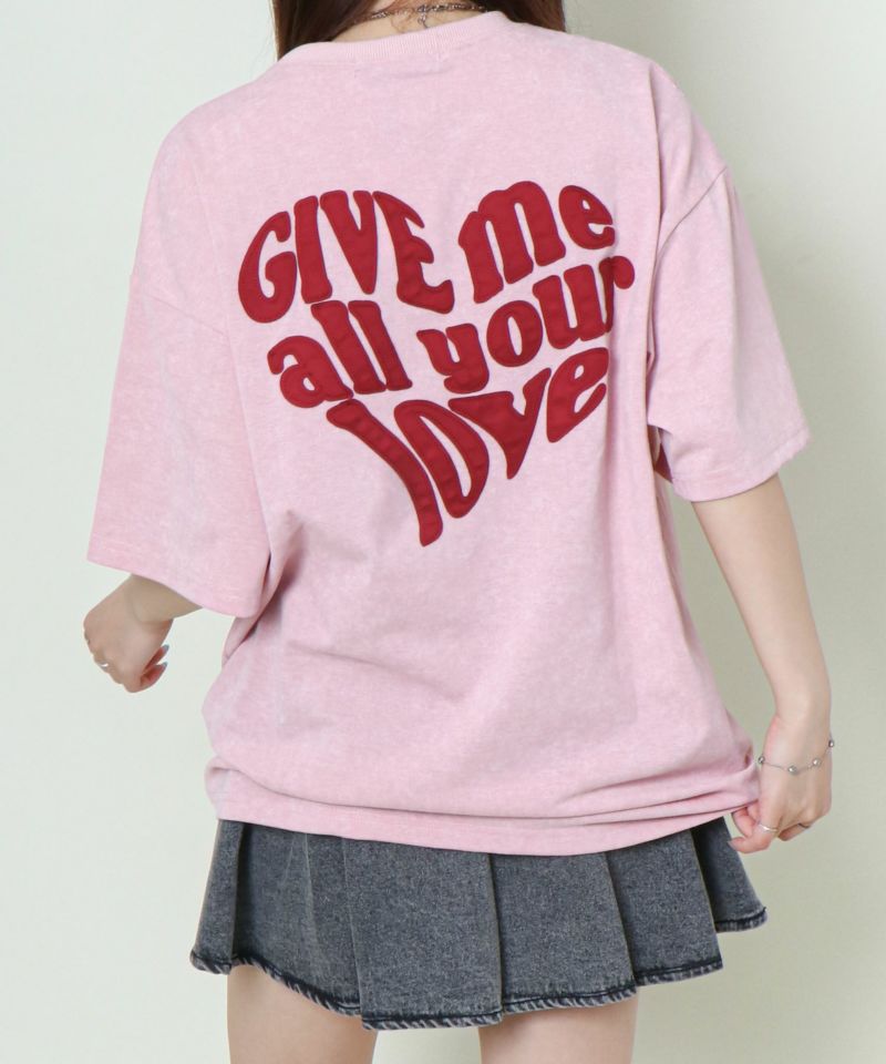 ピグメント風のウォッシュ感がこなれた印象を与えるビッグTシャツ。背中にはインパクトのあるハート型ロゴをツイル素材で大胆にオン!フロントにも同じロゴが小さく刺繍されていて、前後どちらから見ても抜かりのないデザインに仕上がっています。ゆったりとしたシルエットとドロップショルダーで、ラフさの中にもセンスが光ります。