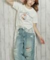 フロントの愛らしい猫プリントと、裾から揺れる繊細なレースが目を引く、ガーリームードたっぷりのデザインTシャツ。