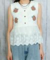 フロントのカラフルなお花モチーフがアクセントになった、ぬくもり感じるフェミニンなデザイン。裾にあしらわれたチュールレースが軽やかさをプラスし、春夏のコーディネートにぴったりの1枚です♪ ボタン開き仕様で着脱もしやすく、レイヤードスタイルに大活躍◎