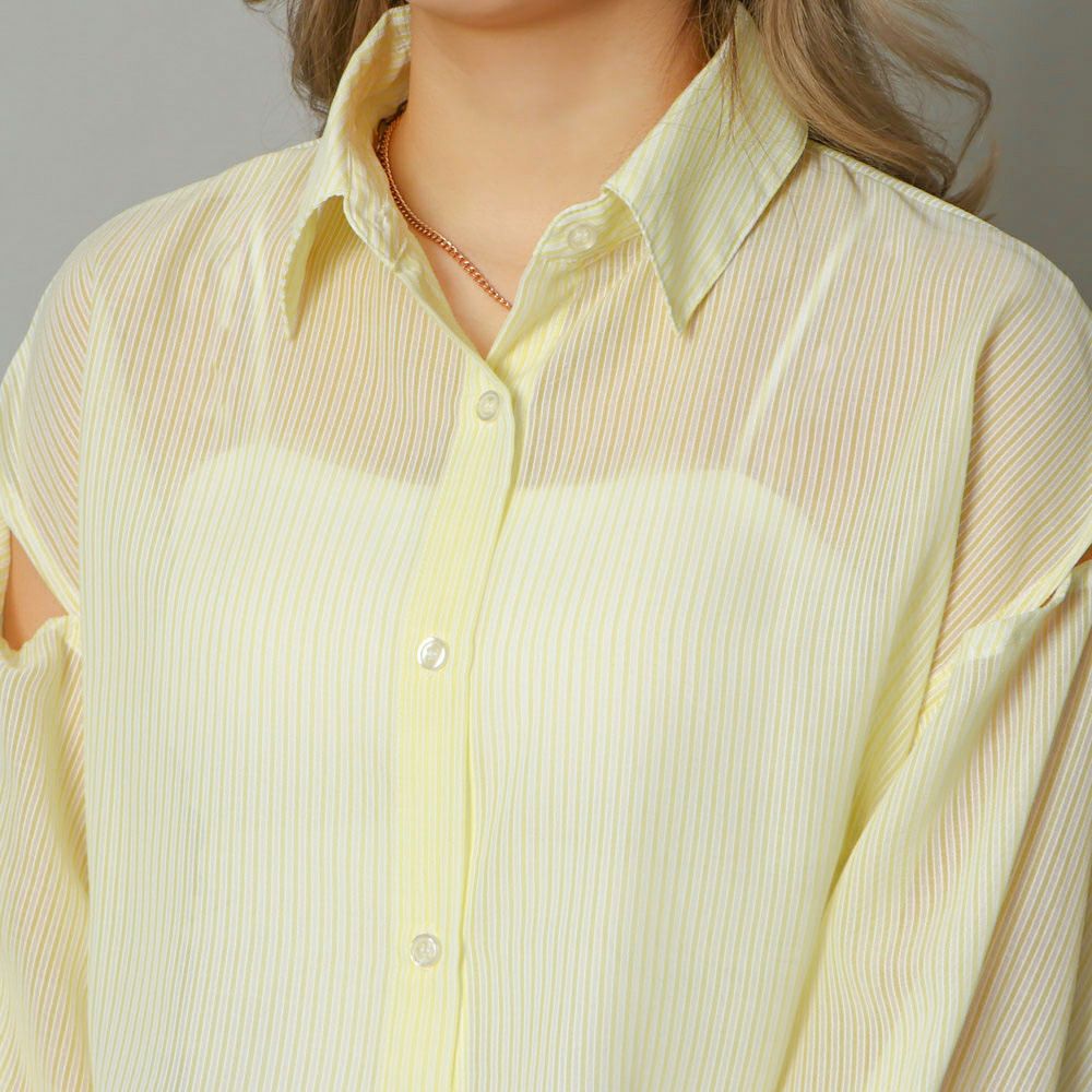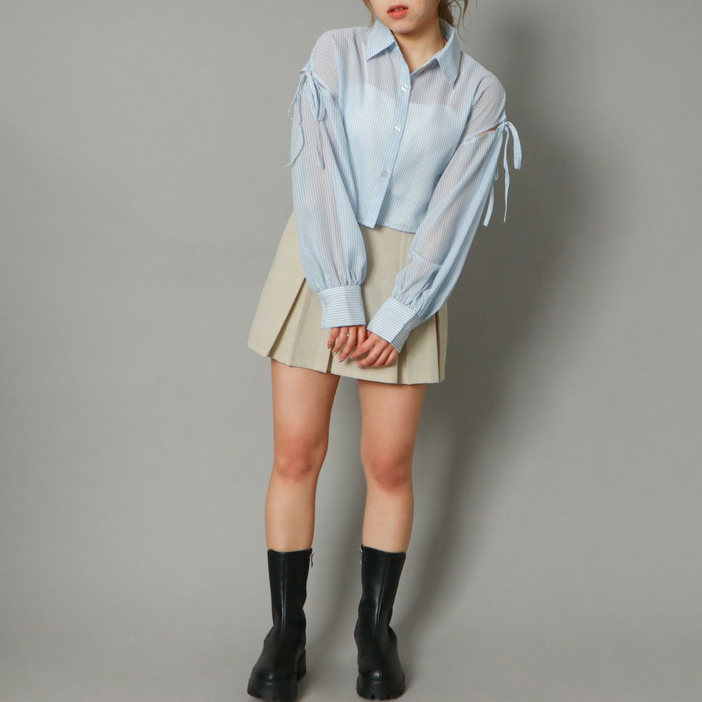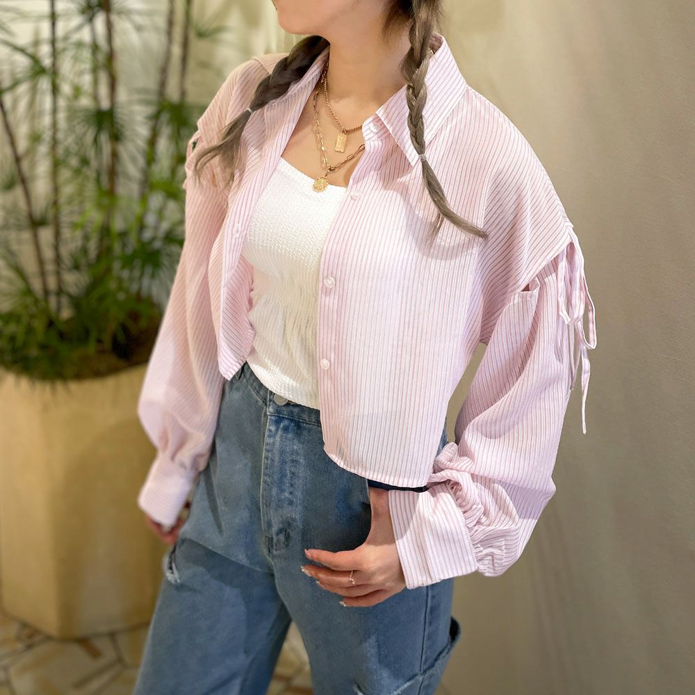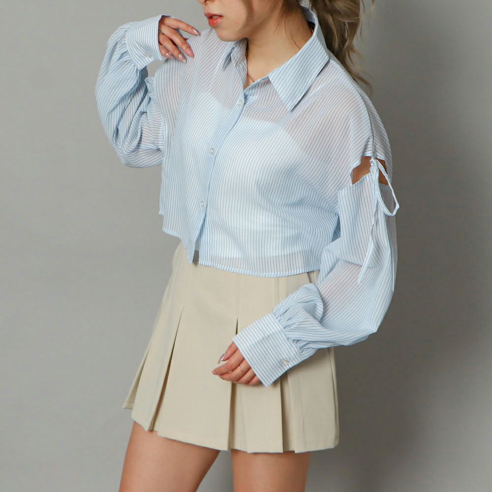 リボン肩開き短丈シャツ