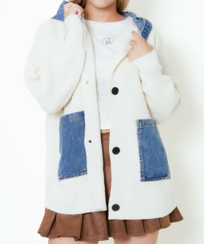 《デニム切替×フード付き》レディース ニットパーカー風カーディガン 秋冬トップスのレビューを書く